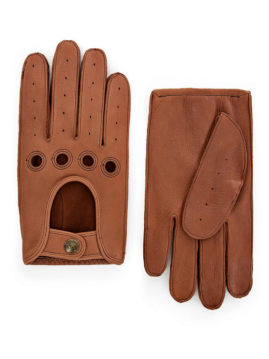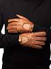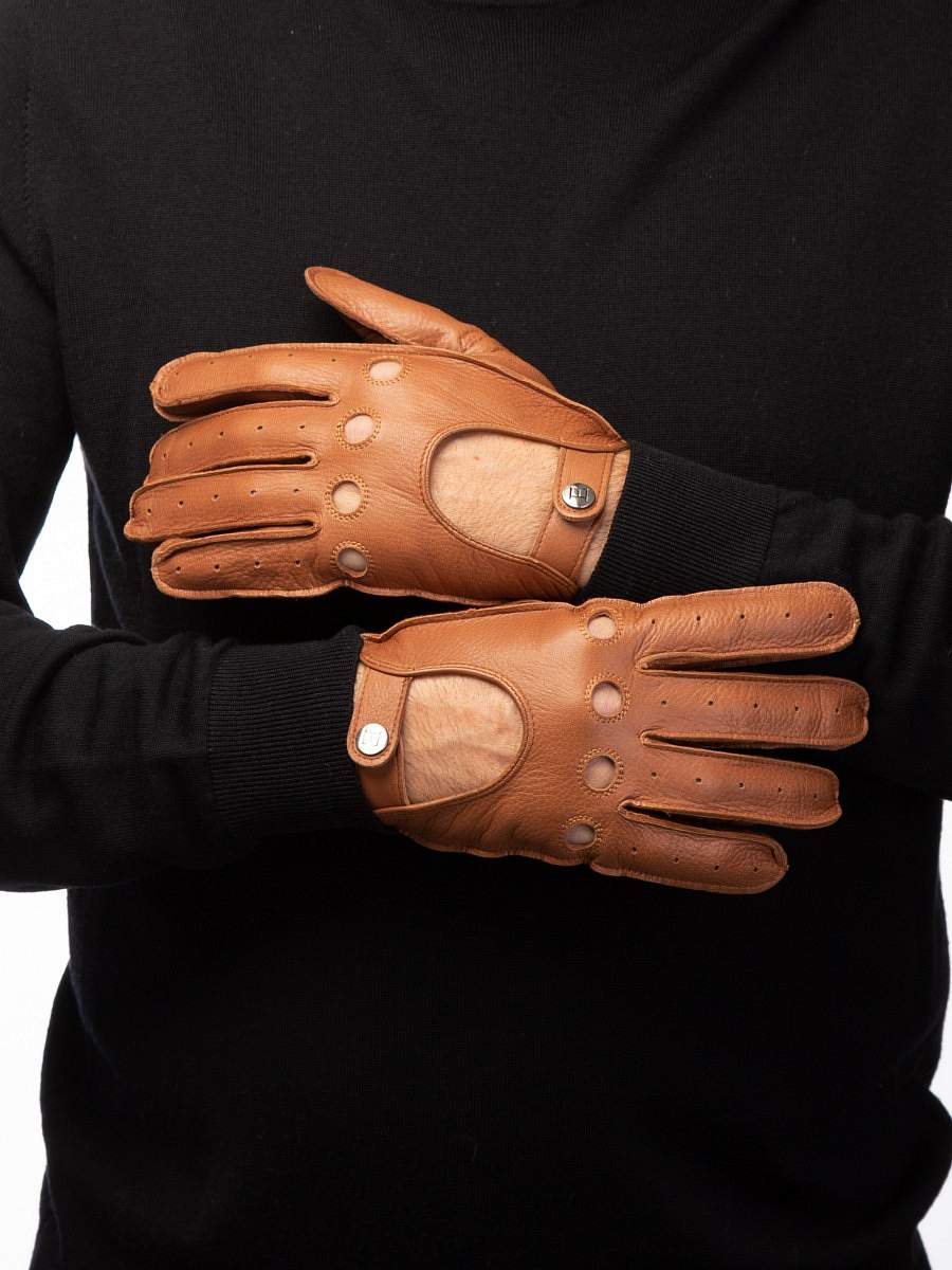 Перчатки торговой марки ELEGANZZA производства Китай, выполнены из натуральной кожи оленя. Швы - машинные наружные. Отделка - перфорация на лицевой стороне; вырезы под косточки пальцев, у которых край обшит; вырез на лицевой стороне с рабочим ремнем на кнопке; . Без подкладки. Длина манжеты от нижней точки большого пальца до края перчаток - 3см. Длина пальцев - средняя.