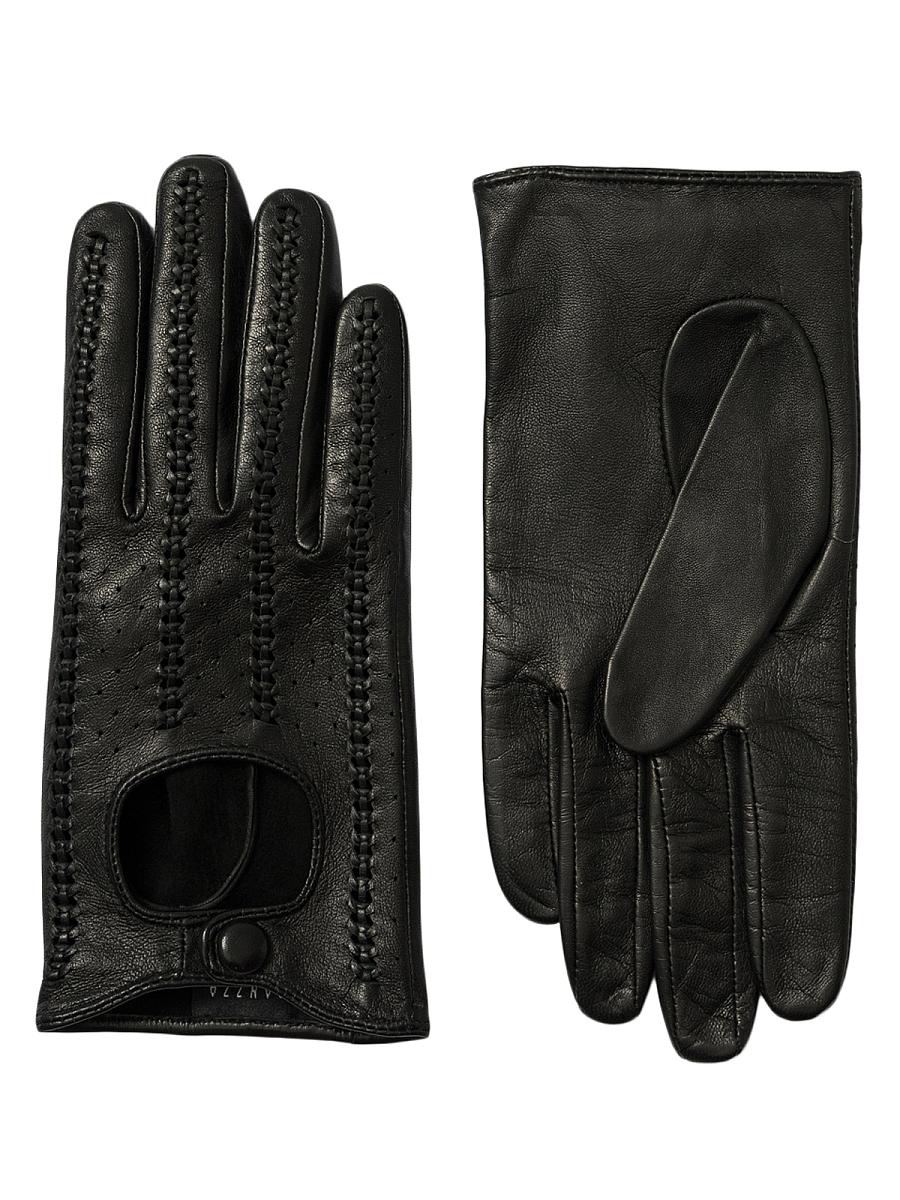Перчатки женские торговой марки ELEGANZZA. Выполнены из высококачественной натуральной кожи ягненка. Без подклада. Изделие украшено деликатной декоративной продержкой, выполненной вручную и с особой тщательностью. На лицевой стороне располагается вырез и кнопка, обтянутая кожей. Модель со средней длиной пальцев и длиной манжеты от нижней точки большого пальца до края перчаток - 3 см.