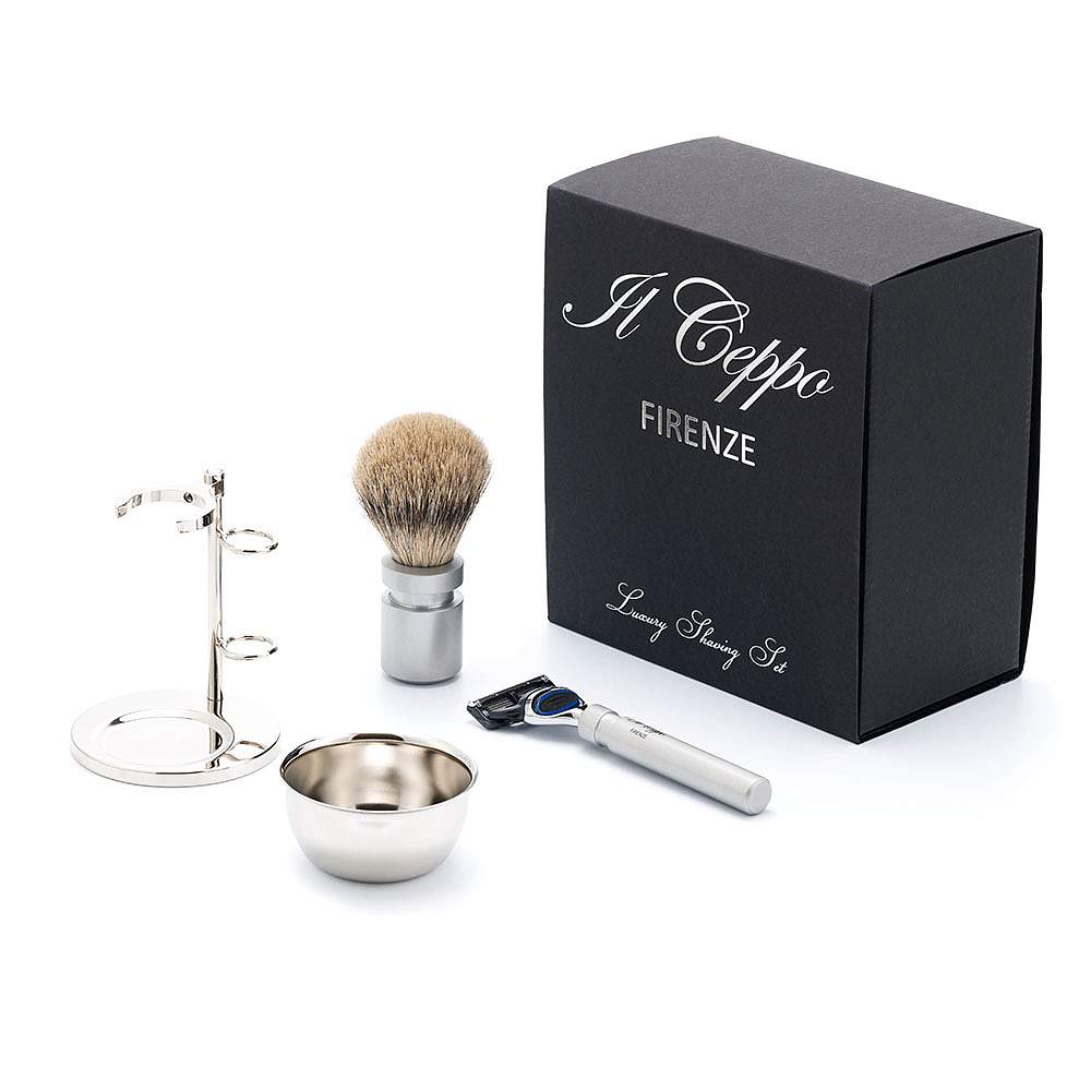Бритвенный набор IL Ceppo: станок, помазок, подставка, чаша, алюминий/никелированная латунь, FUSION, натуральный ворс барсука BEST BADGER SET-S12070FT