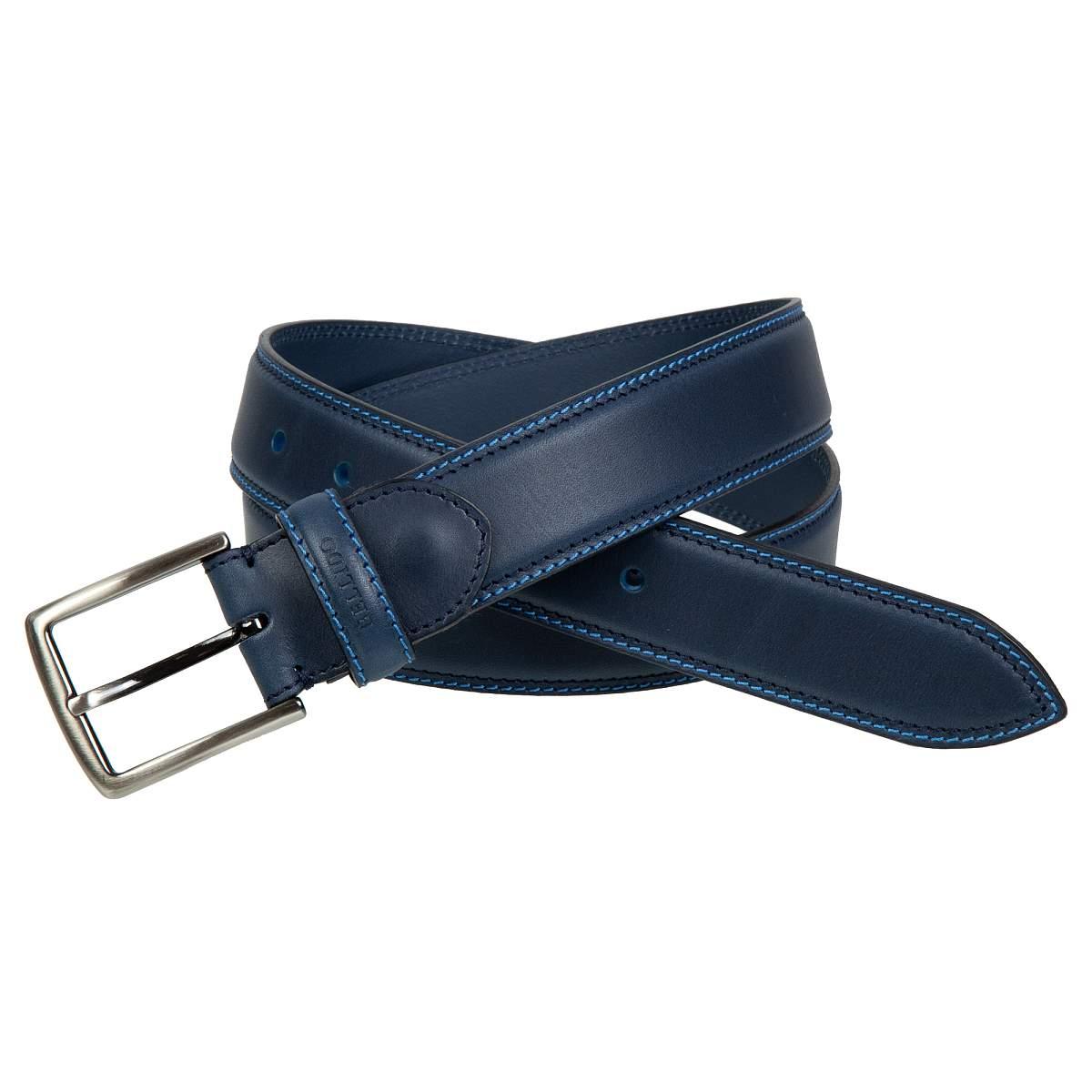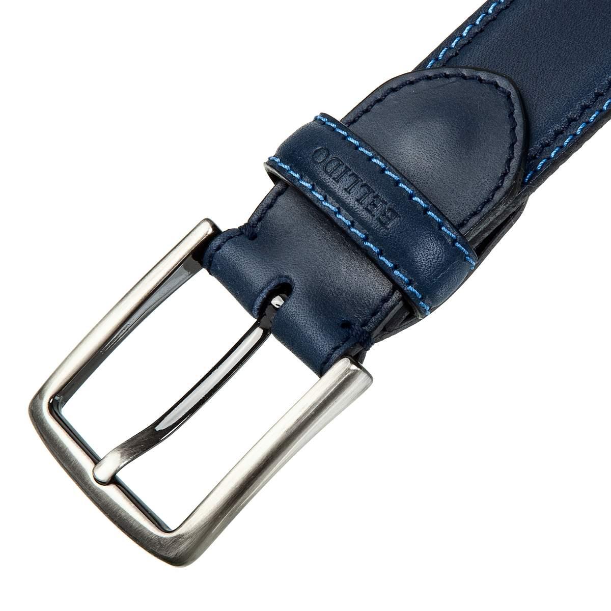 Брючный ремень из натуральной кожи высочайшего качества с перфорированной синей строчкой. Пряжка размерами 5 х 4,3 см с отделкой под серебро. Регулируется по длине.