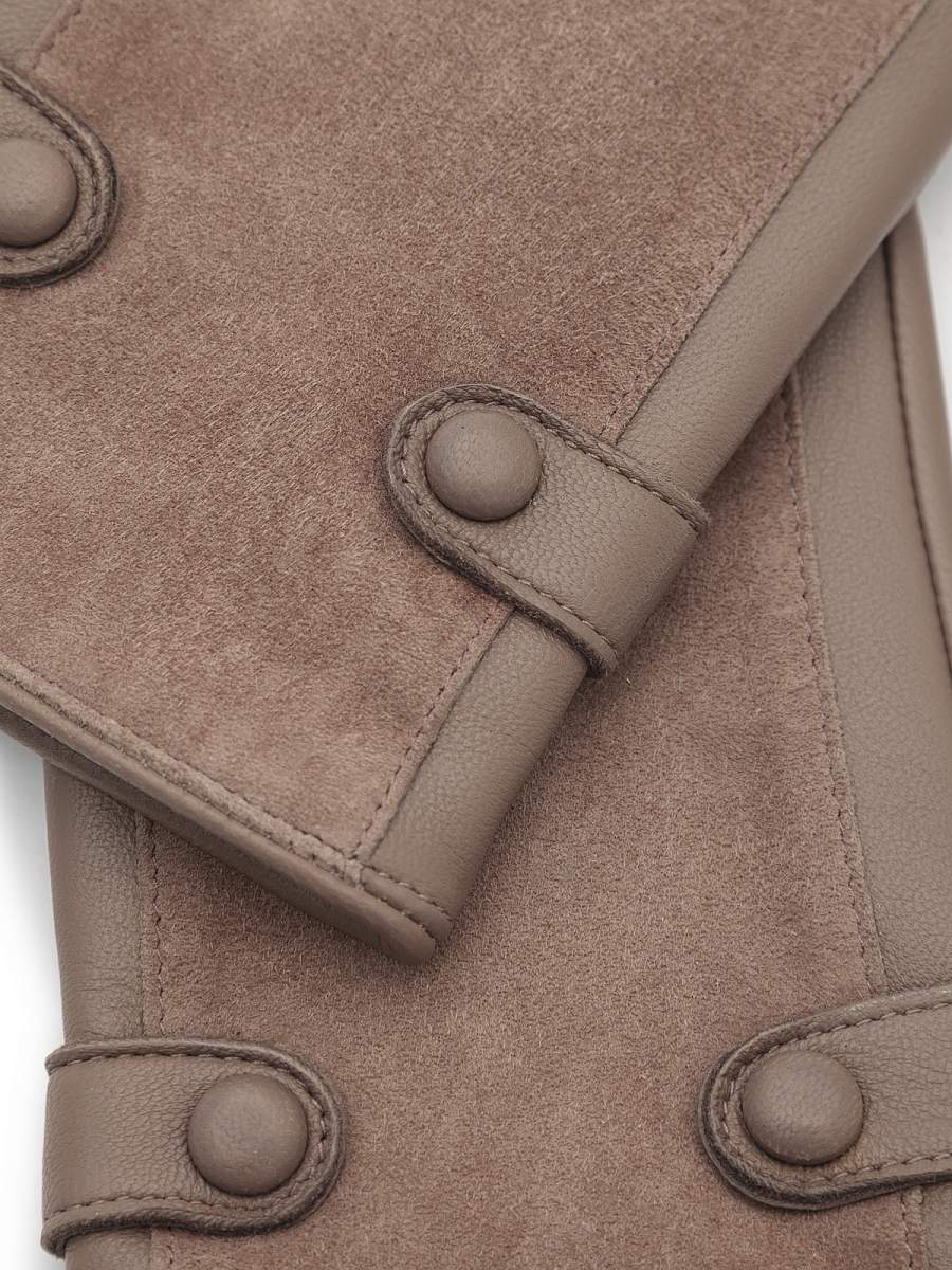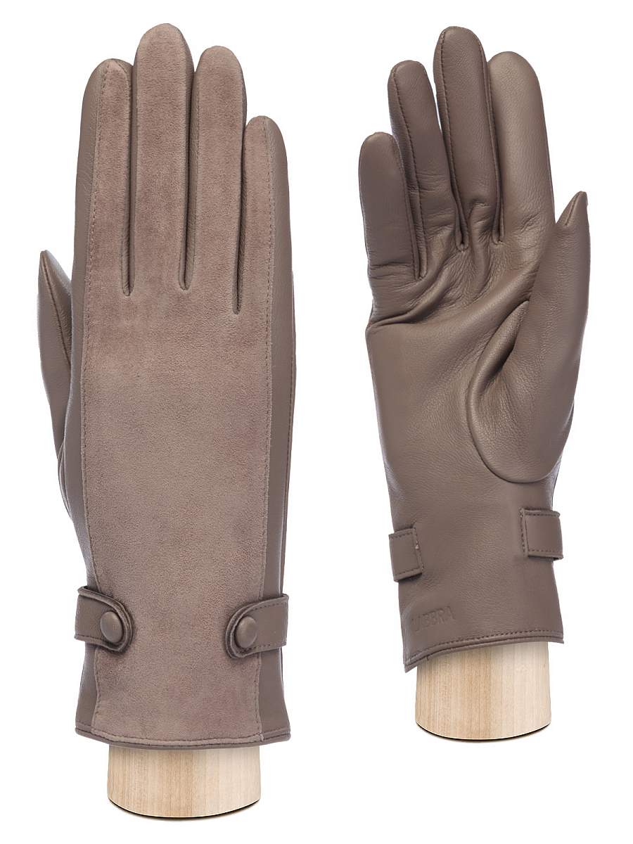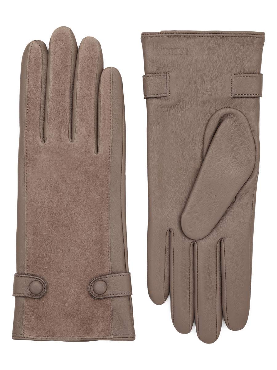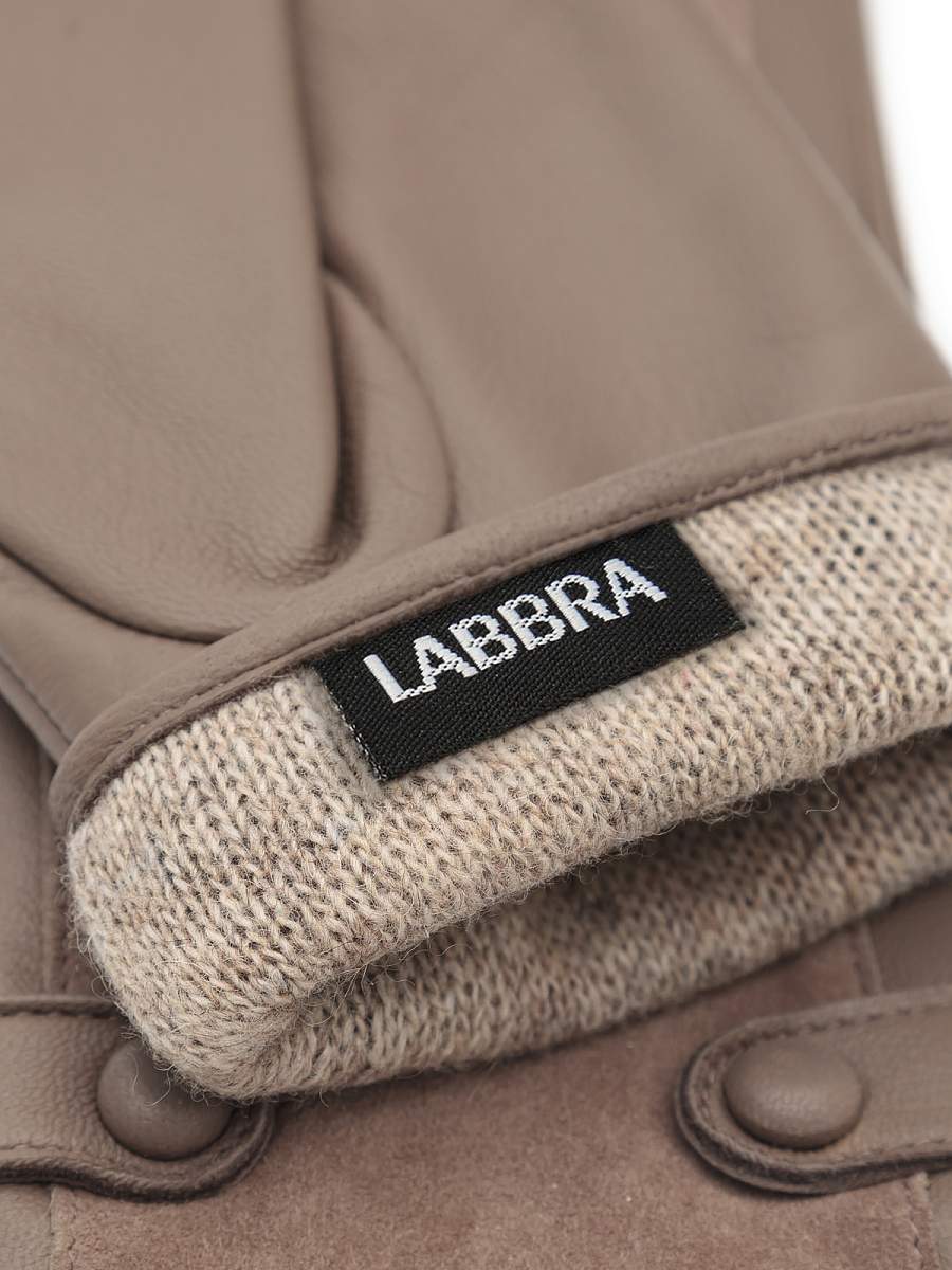 Перчатки женские торговой марки LABBRA производства Китай. Выполнены из натуральной кожи ягненка. Подкладка: 70% шерсть + 30% акрил. Перчатка из кожи на ладонной части и велюра в тон кожи на внешней, в области запястья украшена декоративными ремешками. Длина манжеты от нижней точки большого пальца до края перчаток - 6 см. Длина пальцев - средняя.