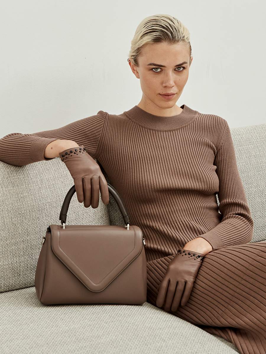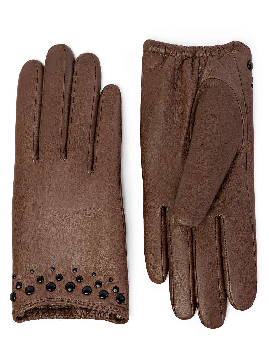 Перчатки женские торговой марки ELEGANZZA из натуральной итальянской кожи ягненка. Подкладка: 85% шерсть, 15% кашемир. Отделка - металлические хольнитены разного диаметра цвета черного матового цвета по линии манжеты. Длина манжеты от нижней точки большого пальца до края перчаток составляет - 2,5 см. Длина пальцев - средняя.