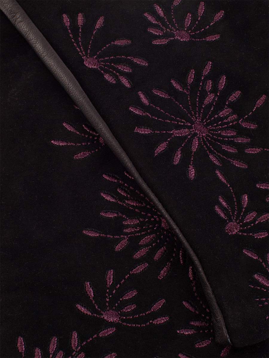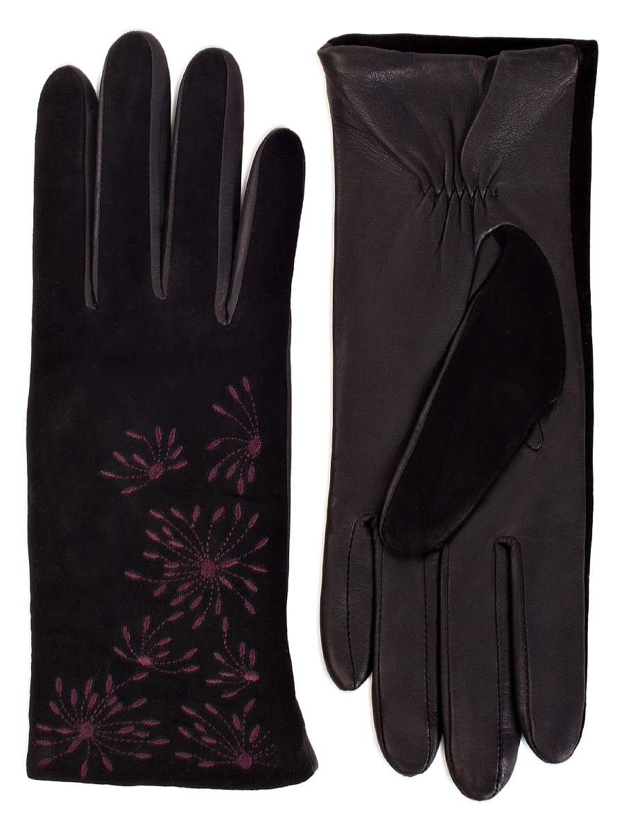 Перчатки женские торговой марки ELEGANZZA из натуральной итальянской кожи ягненка и натурального велюра на лицевой части. Подкладка: 85% шерсть + 15% кашемир. Отделка - декоративная вышивка в цветочной тематике. Длина манжеты от нижней точки большого пальца до края перчаток - 6,5 см. Длина пальцев - средняя.
