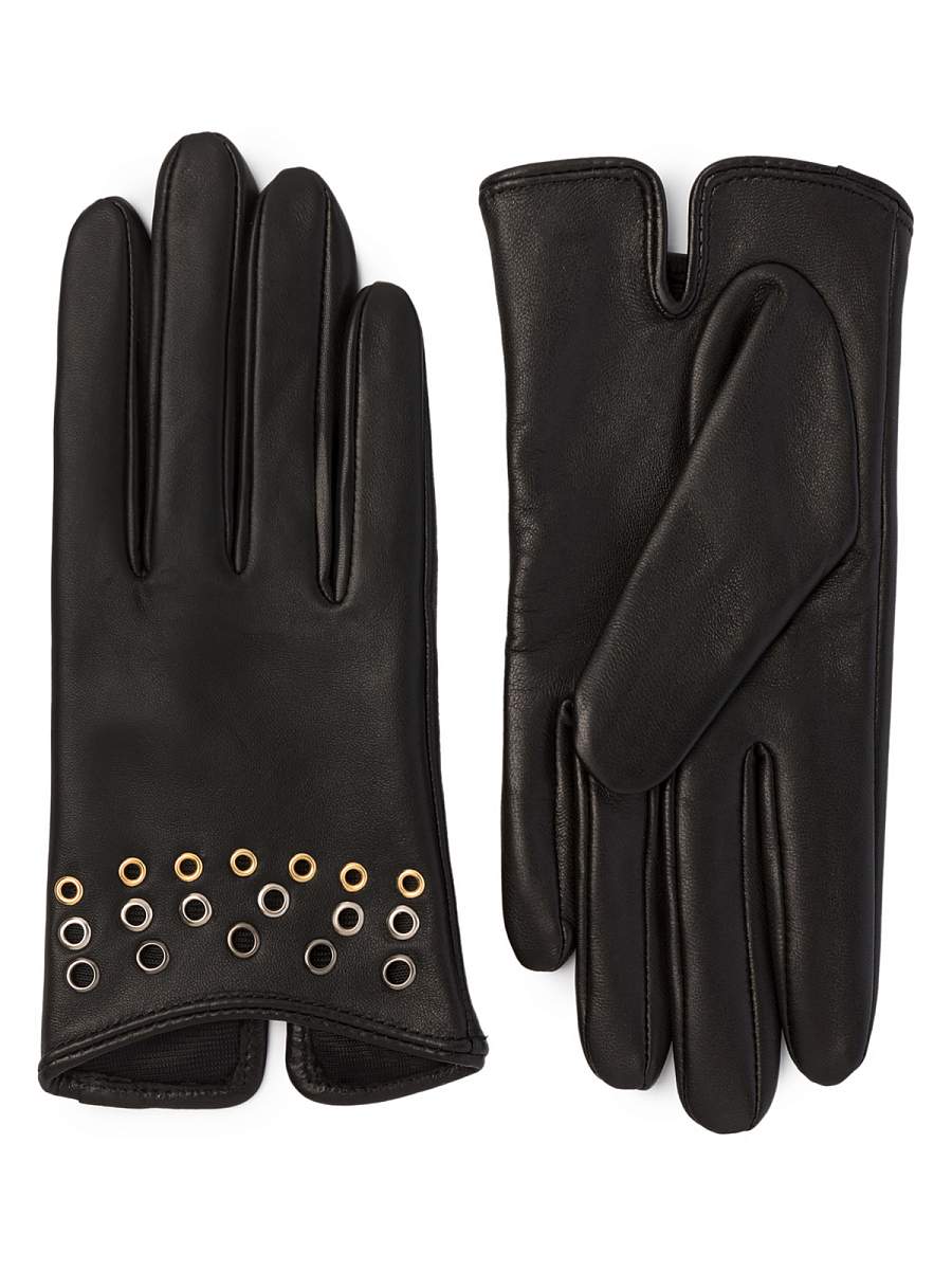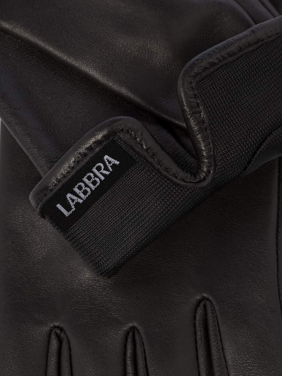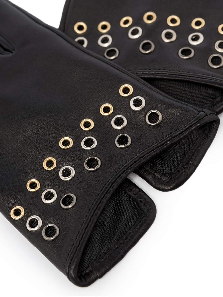 Перчатки женские торговой марки LABBRA производства Китай выполнены из натуральной кожи ягнёнка. Подкладка: шелк. Отделка - металлические люверсы на лицевой части, имитирующие браслет. Длина манжеты от нижней точки большого пальца до края перчаток - 2 см. Длина пальцев - средняя.