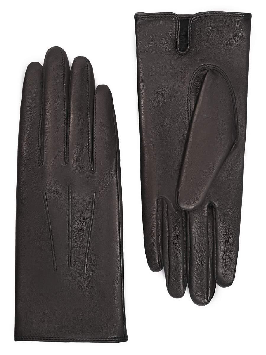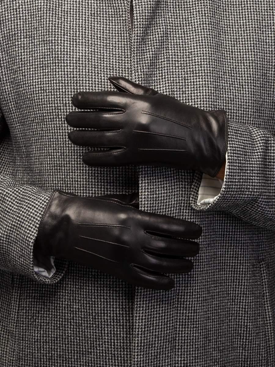 Перчатки торговой марки ELEGANZZA производства Италии выполнены из кожи ягнёнка чёрного цвета. Подкладка: шёлк. Отделка - декоративные швы "три луча". Нижний край перчатки и разрез на ладонной стороне (глубина 3 см) окантованы. Длина манжеты от нижней точки большого пальца до края перчаток - 4 см.