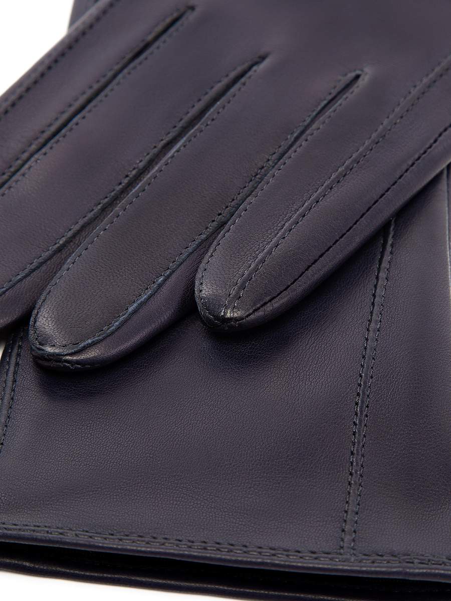 Перчатки торговой марки ELEGANZZA производства Италии, выполнены из натуральной кожи ягнёнка. Подкладка: шелк. Отделка - декоративные швы от нижнего края перчатки и до кончиков мизинца и указательного пальцев. Нижний край перчатки окантован. Резинка на ладонной стороне. Длина манжеты от нижней точки большого пальца до края перчаток - 8 см. Длина пальцев - средняя.