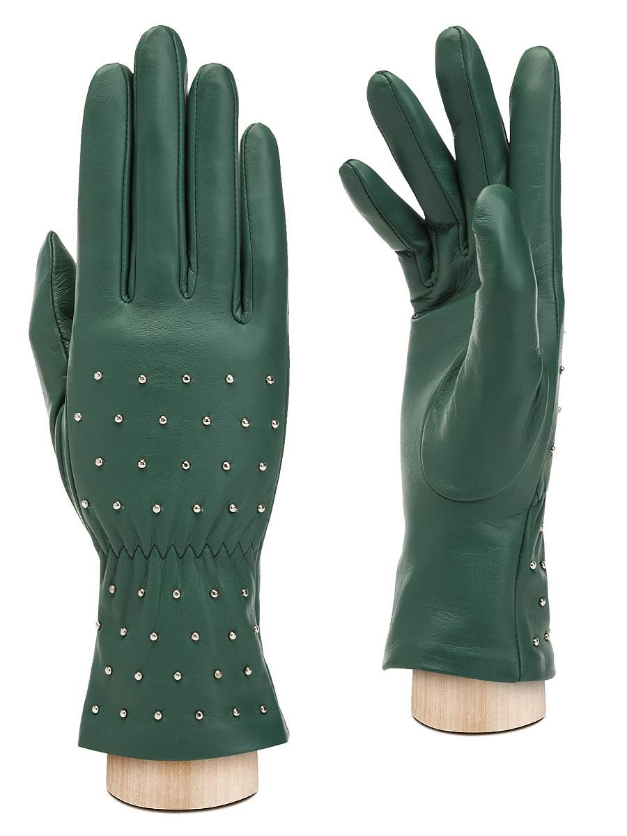 Перчатки женские торговой марки ELEGANZZA из натуральной кожи ягненка. Производство Китай. Подкладка: 100% шерсть. Отделка - декоративные хольитены на лицевой части, резинка в районе запясться, которая делает более плотной фиксацию манжета. Длина манжеты от нижней точки большого пальца до края перчаток - 5,5 см. Длина пальцев - средняя.