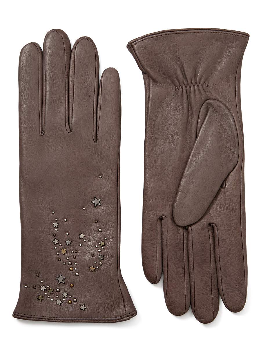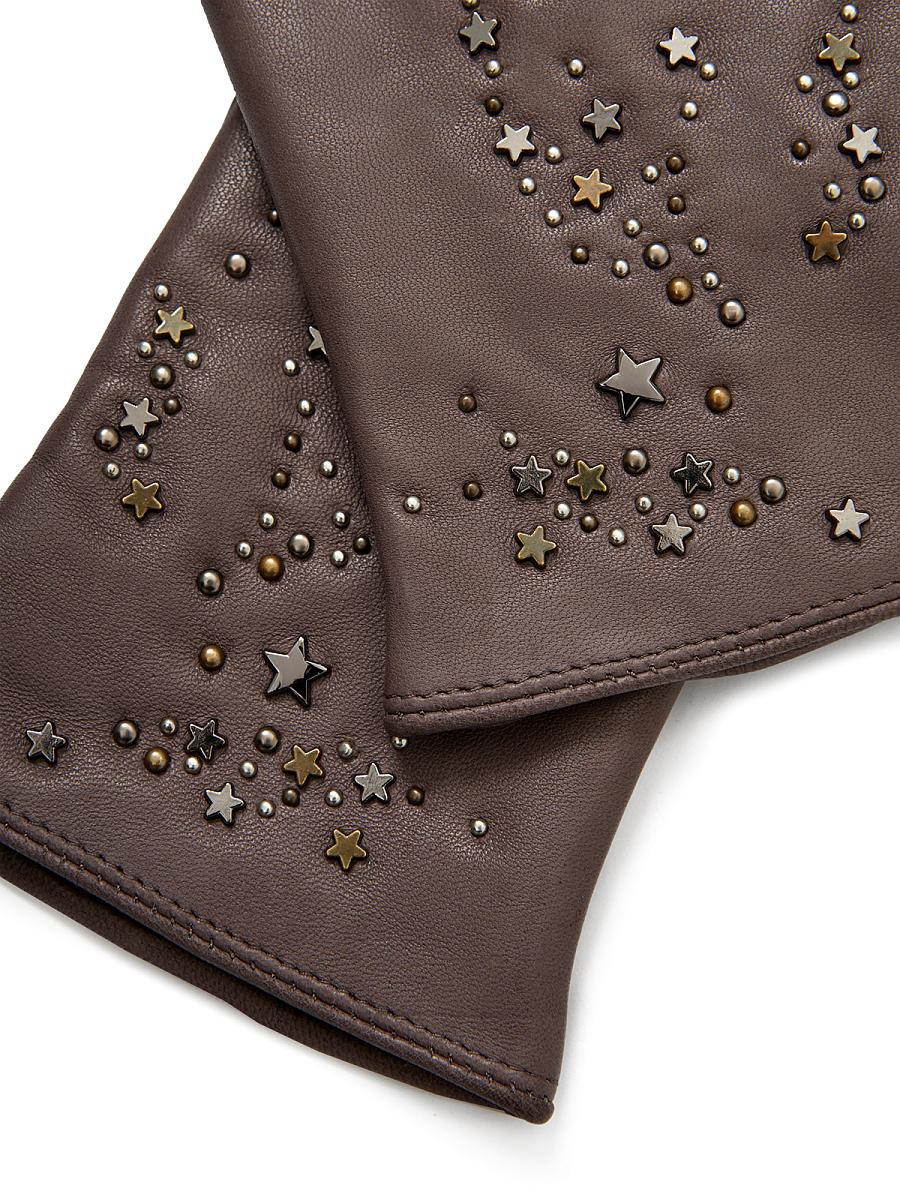 Перчатки женские торговой марки ELEGANZZA. Выполнены из эксклюзивной итальянской кожи ягнёнка в трендовом цвете сезона и дополнены шерстяным подкладом с добавлением кашемира. Декорированы россыпью металлических хольнитенов, создающих замысловатый узор. Модель со средней длиной пальцев и длиной манжеты от нижней точки большого пальца до края перчаток - 6 см.