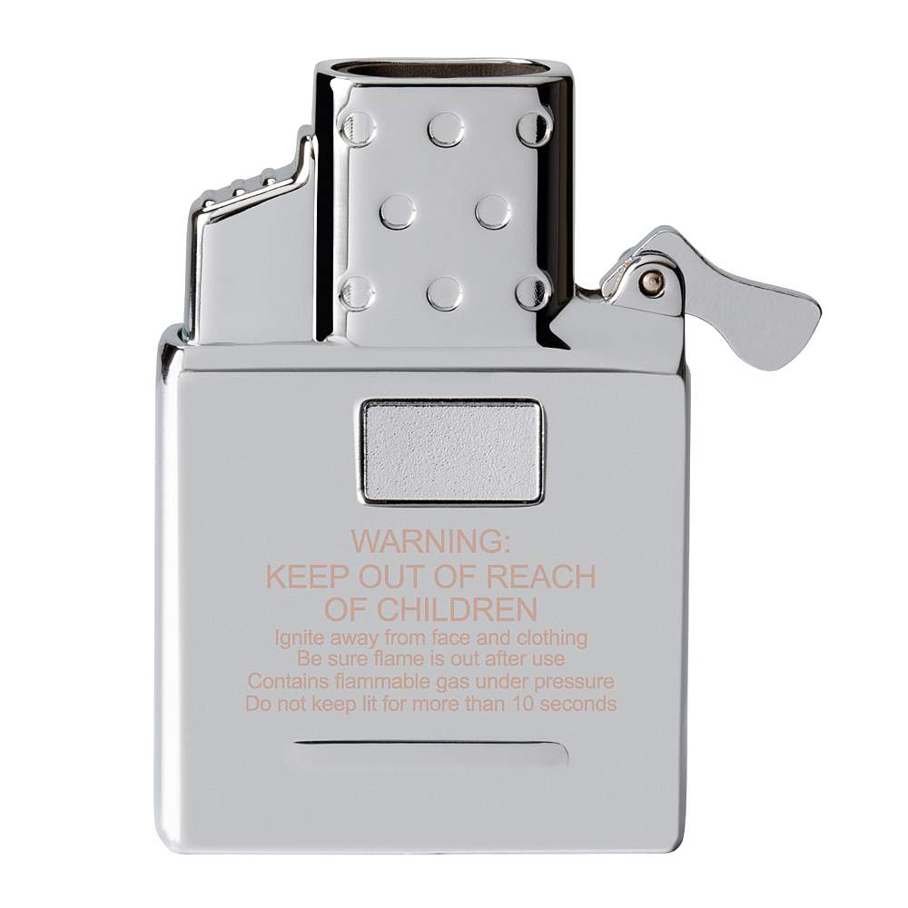 Сделайте еще один значимый шаг на пути к индивидуализации своей зажигалки за счет оригинального вставного блока. Как по мановению руки после легкого щелчка кнопки появляется двойной язычок яркого голубого пламени.