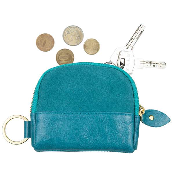 Миниатюрный кошелёчек из натуральной кожи и вставкой из замши. На кошельке есть кольцо для ключей, а так же кошелек можно использовать как брелок. Внутри есть отделение для визитных карточек и для разных мелочей.