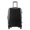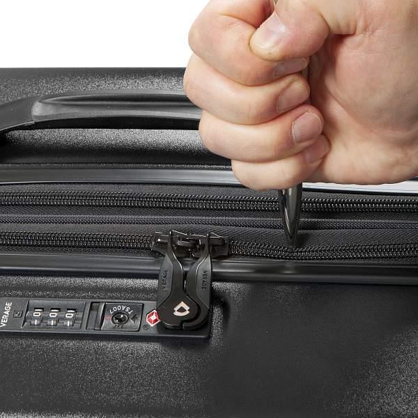 Чемодан из пластика чёрного цвета. Коллекция: Verage «Houston». Выполнен из поликарбоната - материала чрезвычайно прочного, долговечного и легкого. Чемодан оснащён двойной молнией безопасности, что препятствует вскрытию багажа. Внутри отдел максимальной вместимости с перекрёстными лямками и разделителем для одежды, с возможностью увеличения объёма чемодана за счёт молнии (функция невидимого расширения). Также чемодан оснащён выдвижной телескопической ручкой с фиксатором и регулировкой в нескольких положениях, верхней ручкой для удобного подъёма и временной переноски, бесшумными двойными колёсами с поворотом на 360°, кодовым замком TSA. Размер: 28*(L), вес - 4 кг.