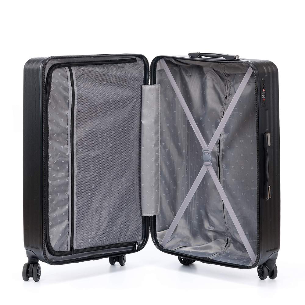 Чемодан полностью раскрывается на 2 вместительных отделения, с перегородкой на молнии и ремнями в форме X для надежной фиксации вещей на месте.