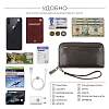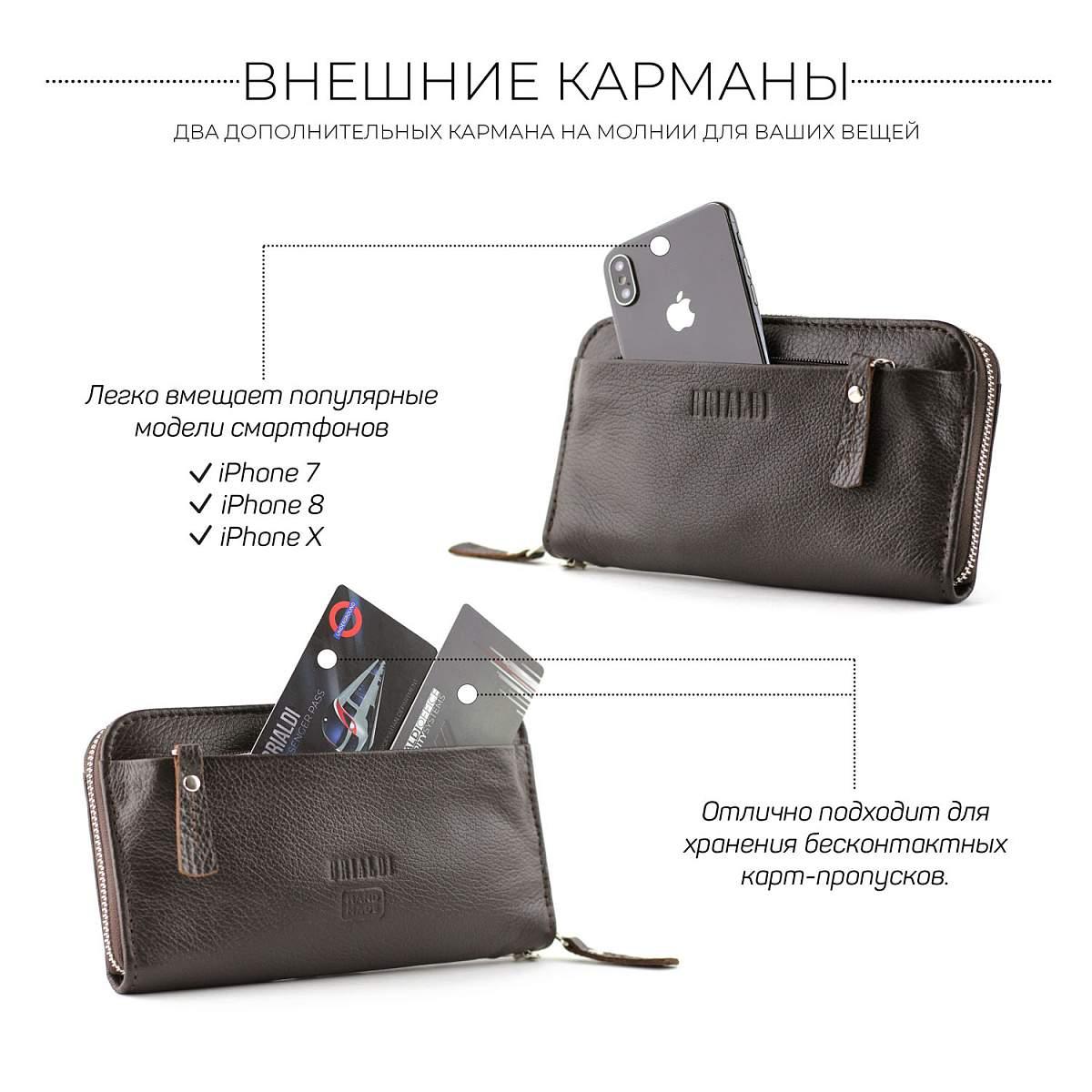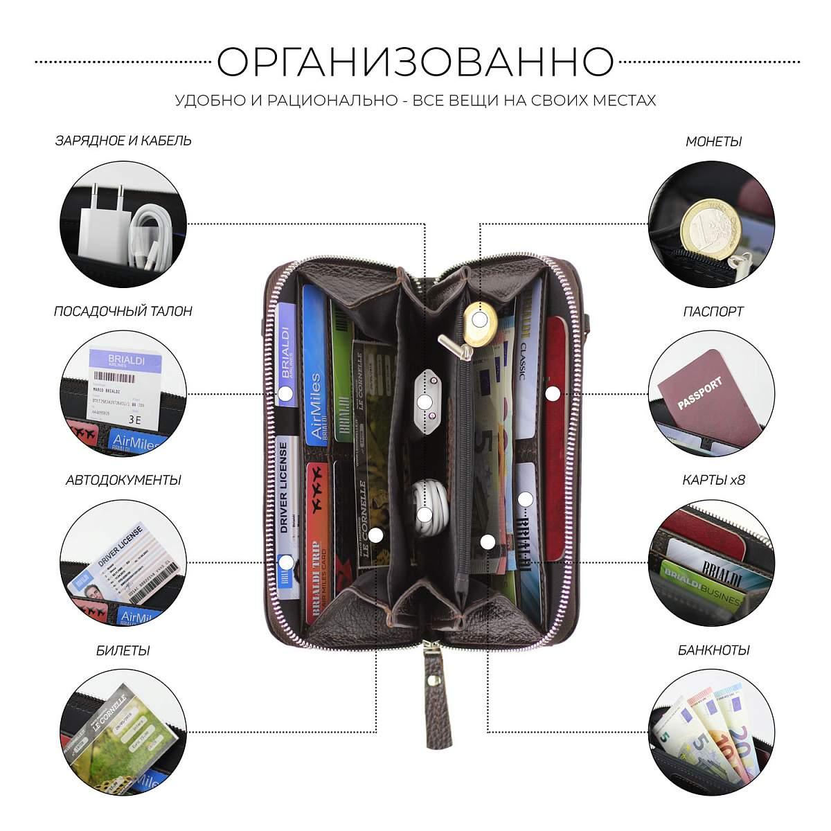 Внутри: два отделения для купюр и телефона, боковые карманы для документов, отделение на молнии для монет, каскад из 8 пазов для пластиковых карт
