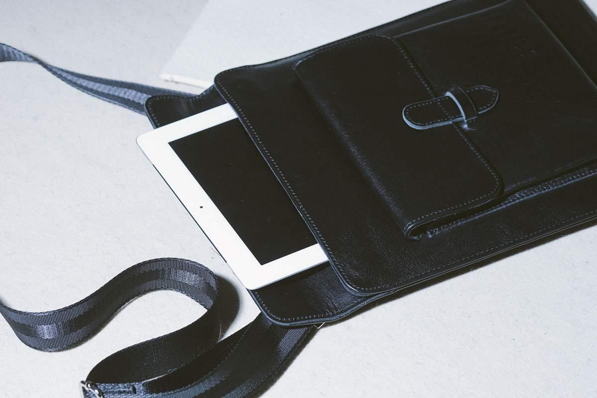 - Регулируемый плечевой ремень Планшет закрывается на три (!!!) скрытых магнита что упрощает его открывание и закрывание