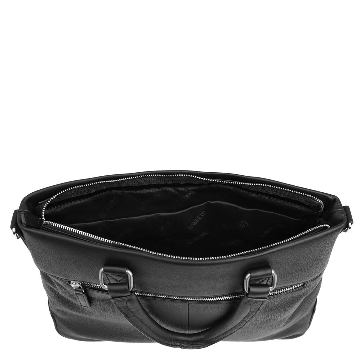 На лицевой стороне расположен вместительный карман на потайном магнитном замке. На тыльной стороне предусмотрен карман быстрого доступа на молнии. Вместительное отделение закрывается на молнию с кожаным поводком. Внутри расположены органайзер для ручек, 3 кармана для мелочей: 2 открытых и на молнии, а также секция с мягкой стенкой для гаджетов. Сумка вмещает формат А4. Цвет фурнитуры - серебро.