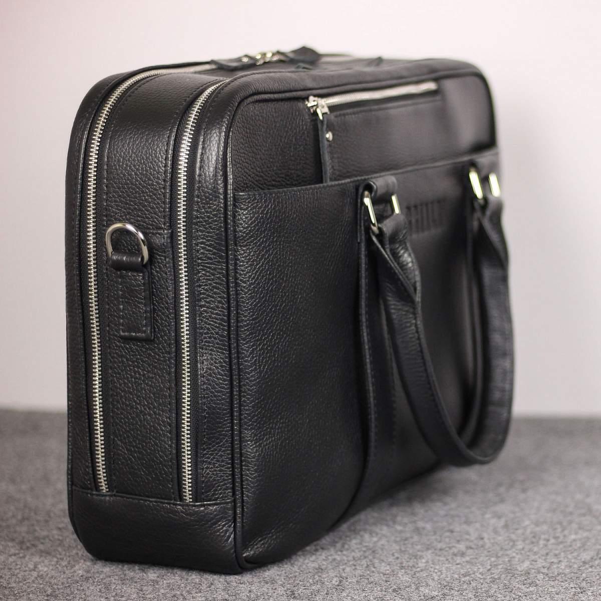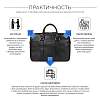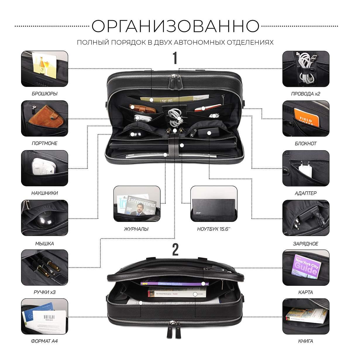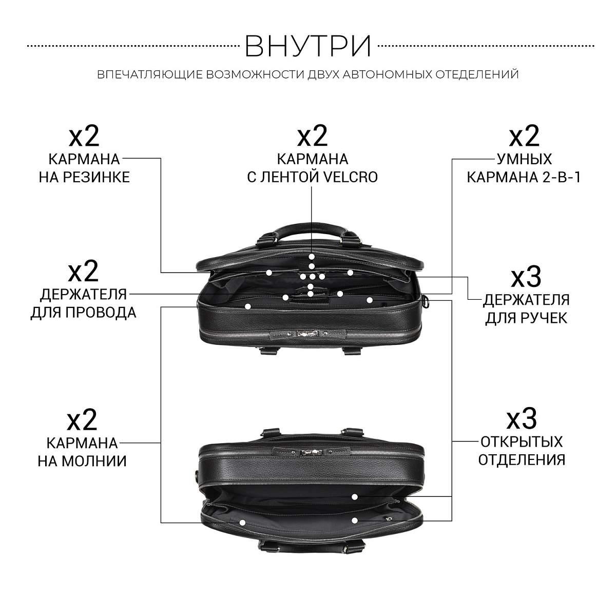 Респектабельная и продуманно сконструированная деловая сумка успешно заменит классический портфель. Устойчивая, строгой формы, с двумя отделениями. Оба отделения глубоко и удобно открываются, а боковые тканевые шторки не позволят выскользнуть содержимому. В первом отделении устроены карманы для смартфона, 3 слота для ручек, 2 петли для проводов, кармана для аксессуаров, отделение для документов формата А4, а так же ноутбука до 15,6” дюймов. Во втором – карман на молнии, два открытых кармана, разделенных карманом-перегородкой. Снаружи на передней и задней панели расположены карманы для документов, со встроенным деловым органайзером, карман для очков, манжет для крепления зонтика или газеты, а так же манжета для крепления на сумку-тележку. У сумки удобные круглые ручки. Съемный плечевой ремень в комплекте.