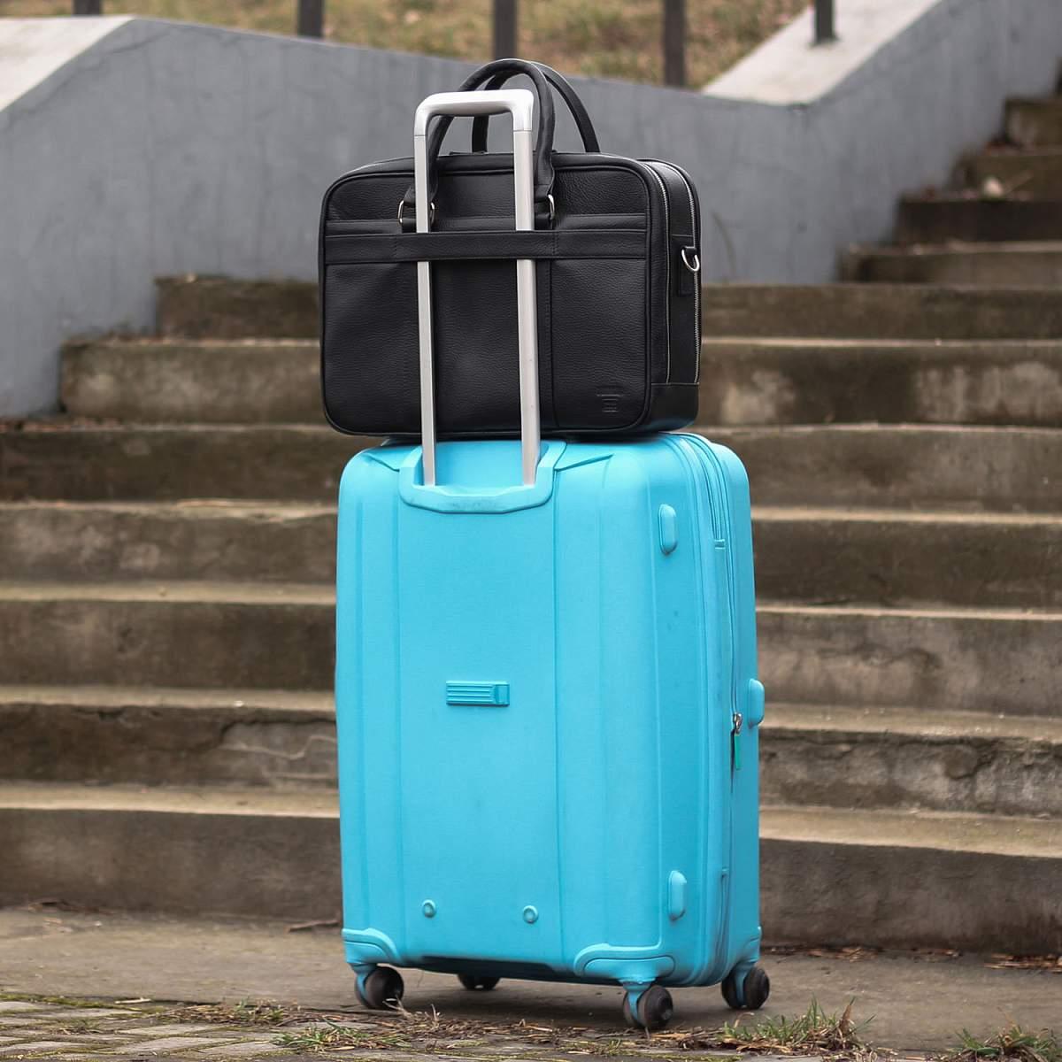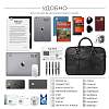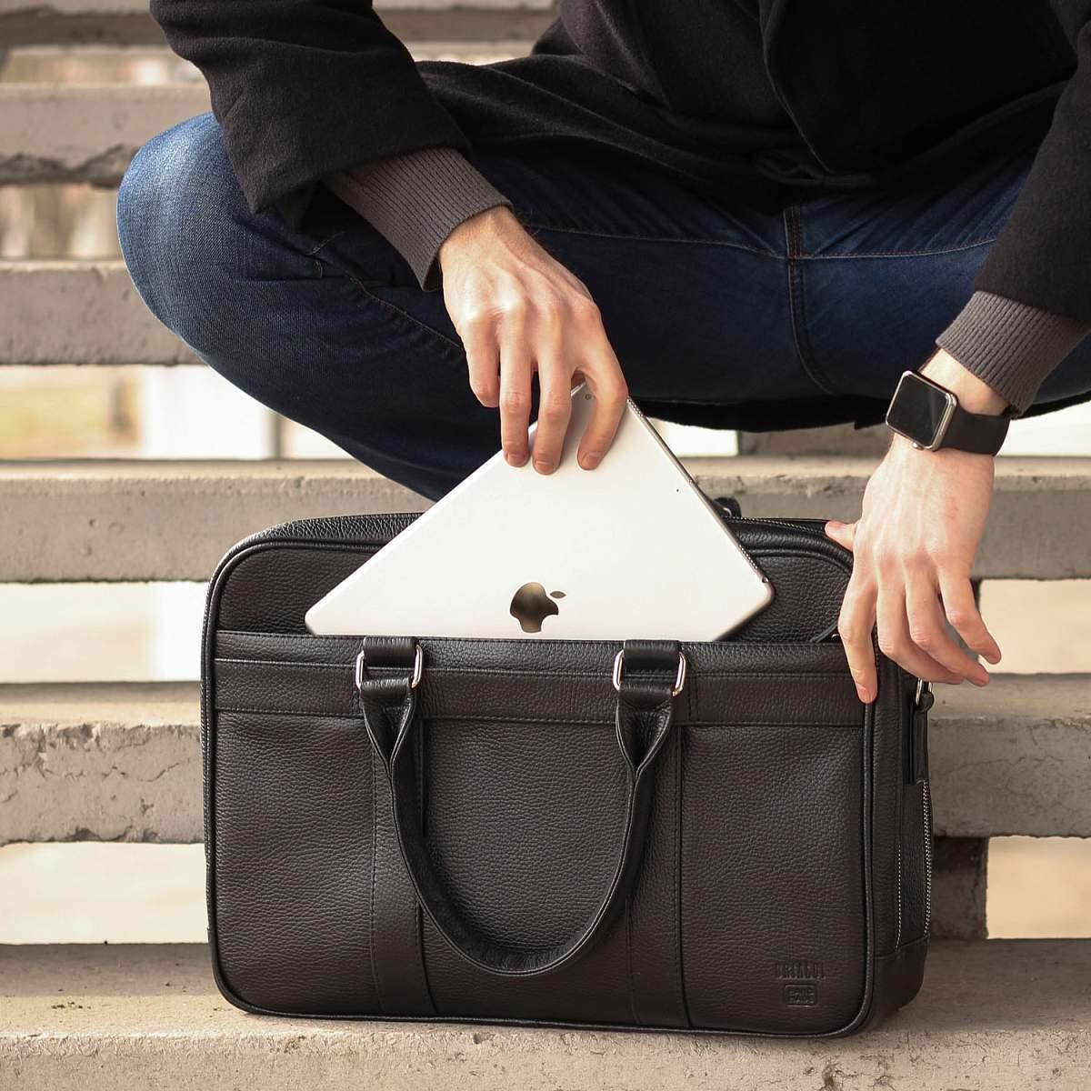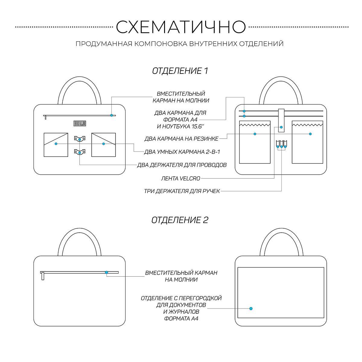 Респектабельная и продуманно сконструированная деловая сумка успешно заменит классический портфель. Устойчивая, строгой формы, с двумя отделениями. Оба отделения глубоко и удобно открываются, а боковые тканевые шторки не позволят выскользнуть содержимому. В первом отделении устроены карманы для смартфона, 3 слота для ручек, 2 петли для проводов, кармана для аксессуаров, отделение для документов формата А4, а так же ноутбука до 15,6” дюймов. Во втором – карман на молнии, два открытых кармана, разделенных карманом-перегородкой. Снаружи на передней и задней панели расположены карманы для документов, со встроенным деловым органайзером, карман для очков, манжет для крепления зонтика или газеты, а так же манжета для крепления на сумку-тележку. У сумки удобные круглые ручки. Съемный плечевой ремень в комплекте.