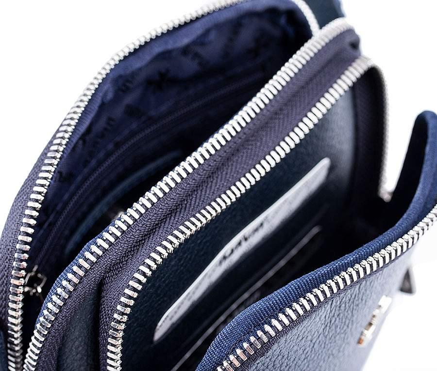 Два основных отделения, внутри карман для кредитных, пластиковых карт с ячейками, отделение для мобильного телефона, кожаная петелька для ручки, потайной карман на молнии.