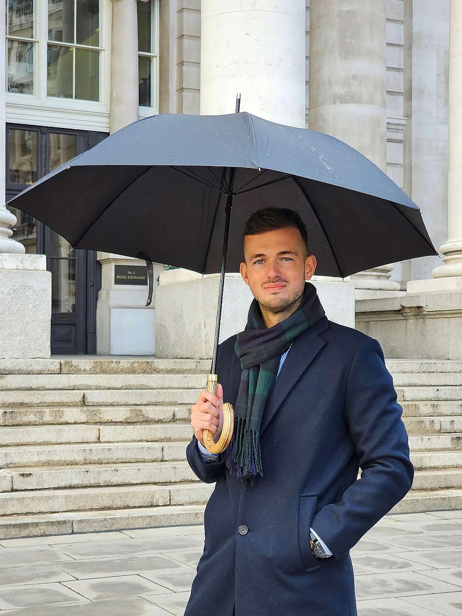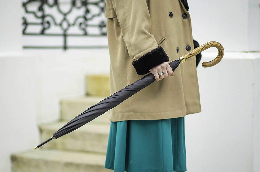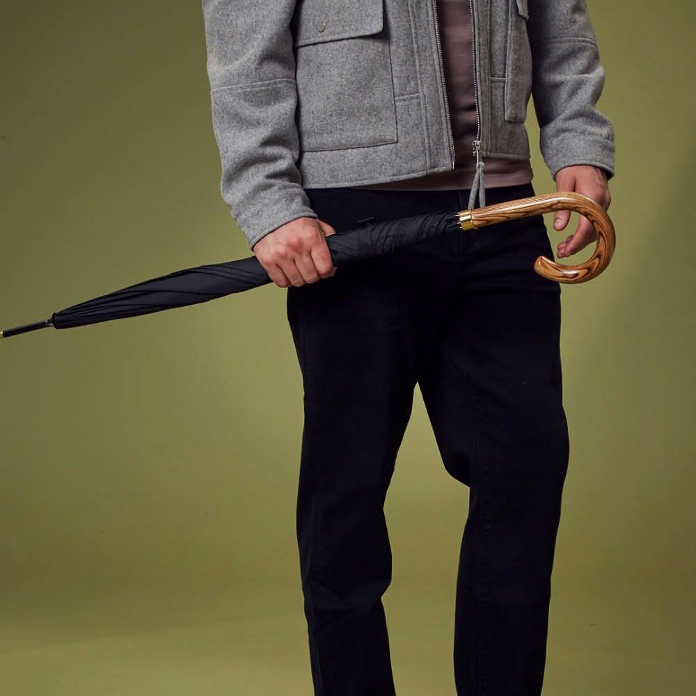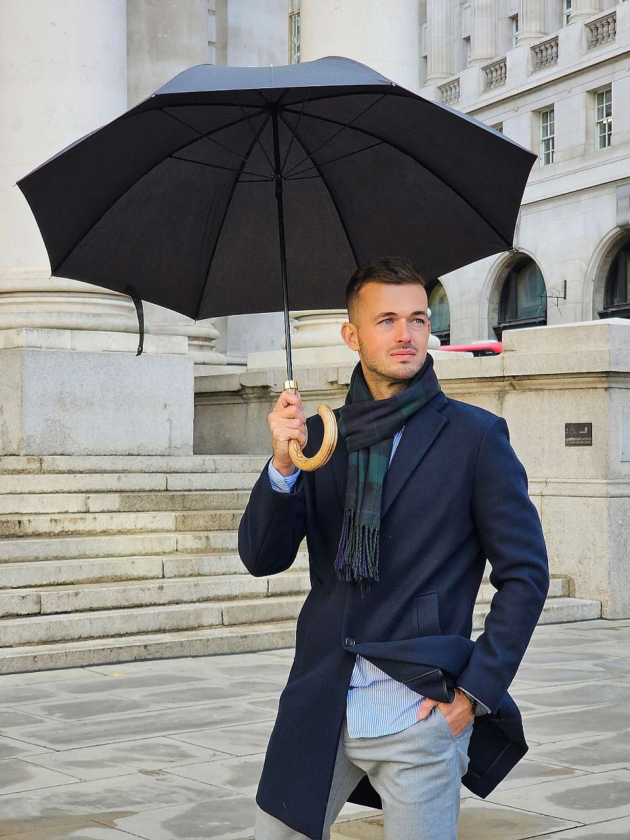 Интересная и редкая прогулочная модель, которую по достоинству оценит человек, ищущий ярких стильных аксессуаров. Отделка шпиля и рукояти металлом моментально обращают на себя внимание, чем выделяют этот зонт из ряда классических мужских. Дизайн модели стильный, чуть винтажный. Деревянная рукоять изящно изогнута и комфортно располагается в ладони. Конструкция каркаса ветроустойчивая.