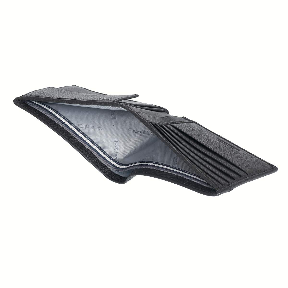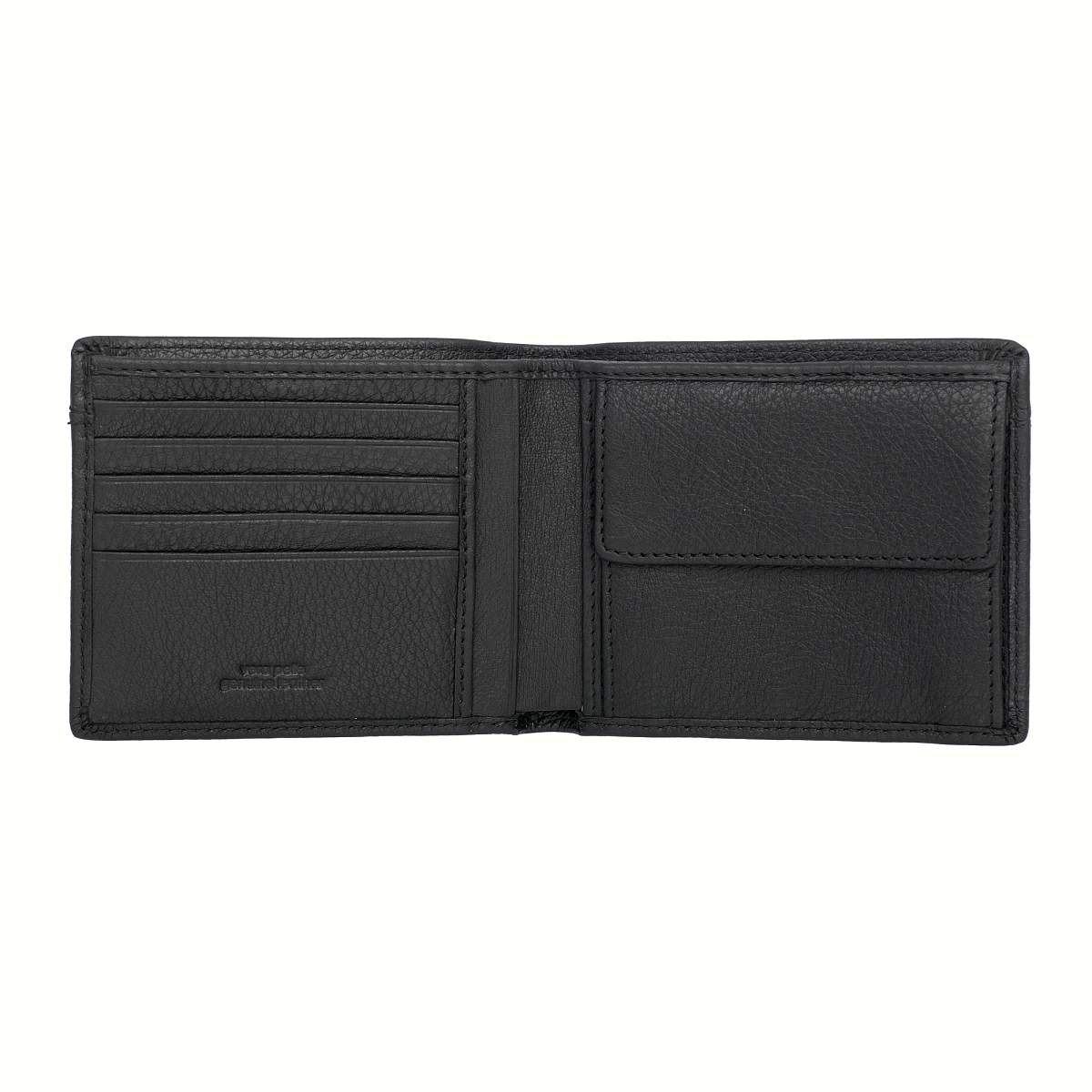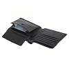 Портмоне раскладывается пополам. Внутри два отделения для купюр, три потайных кармана, шесть отделений для пластиковых карт, карман для мелочи на кнопке.