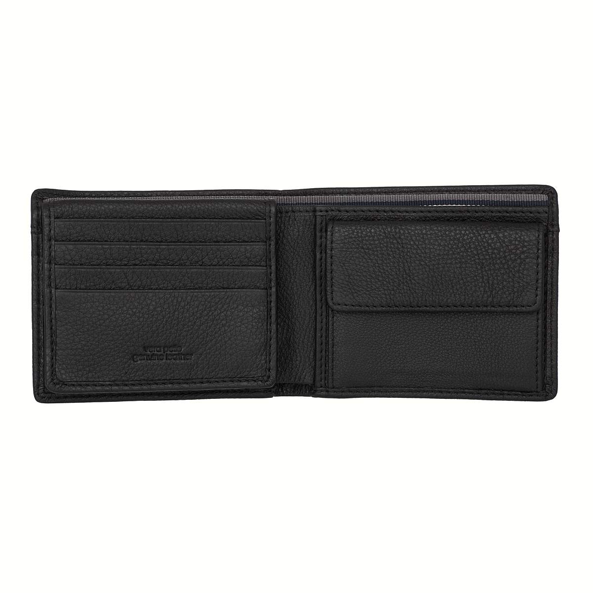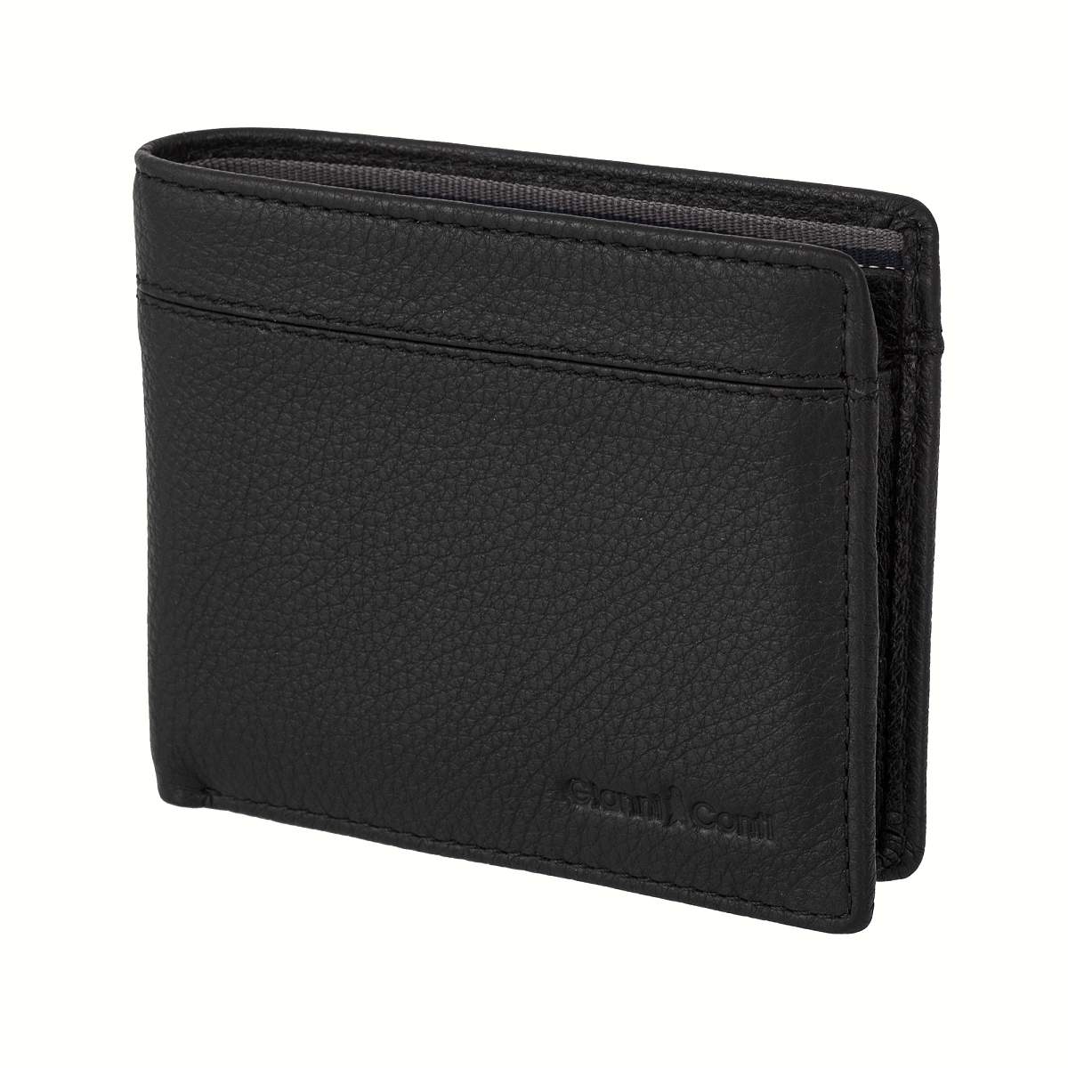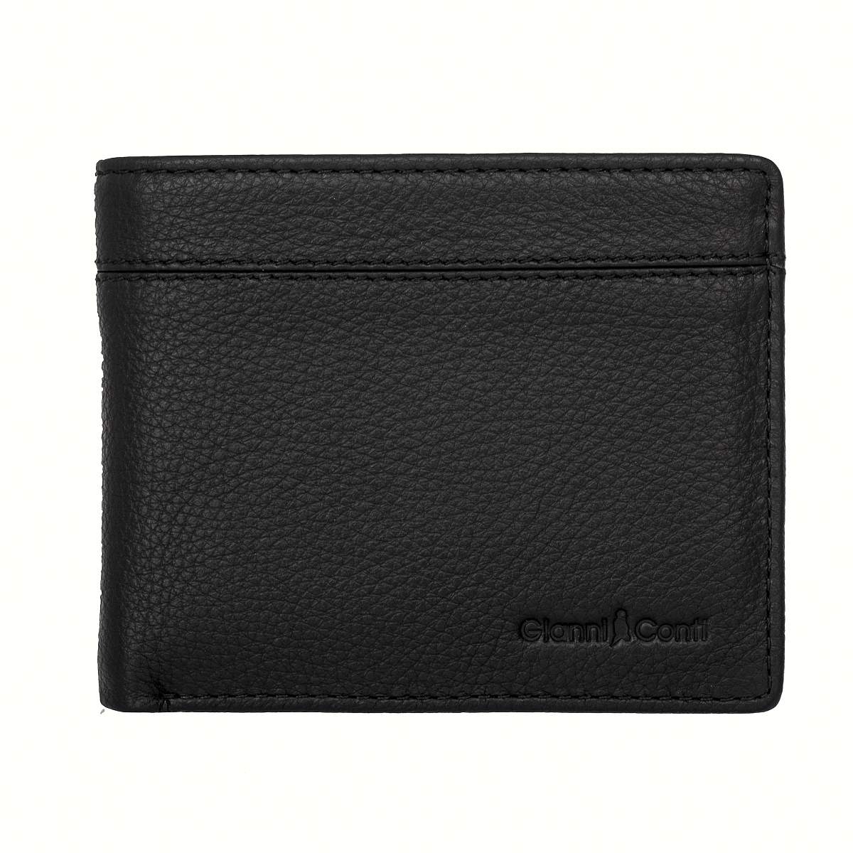 Мужское черное портмоне из натуральной кожи от бренда Gianni Conti. Внутри два отдела для купюр, карман для монет на кнопке, восемь кармашков для пластиковых карт, карман в сеточку и четыре потайных кармана.