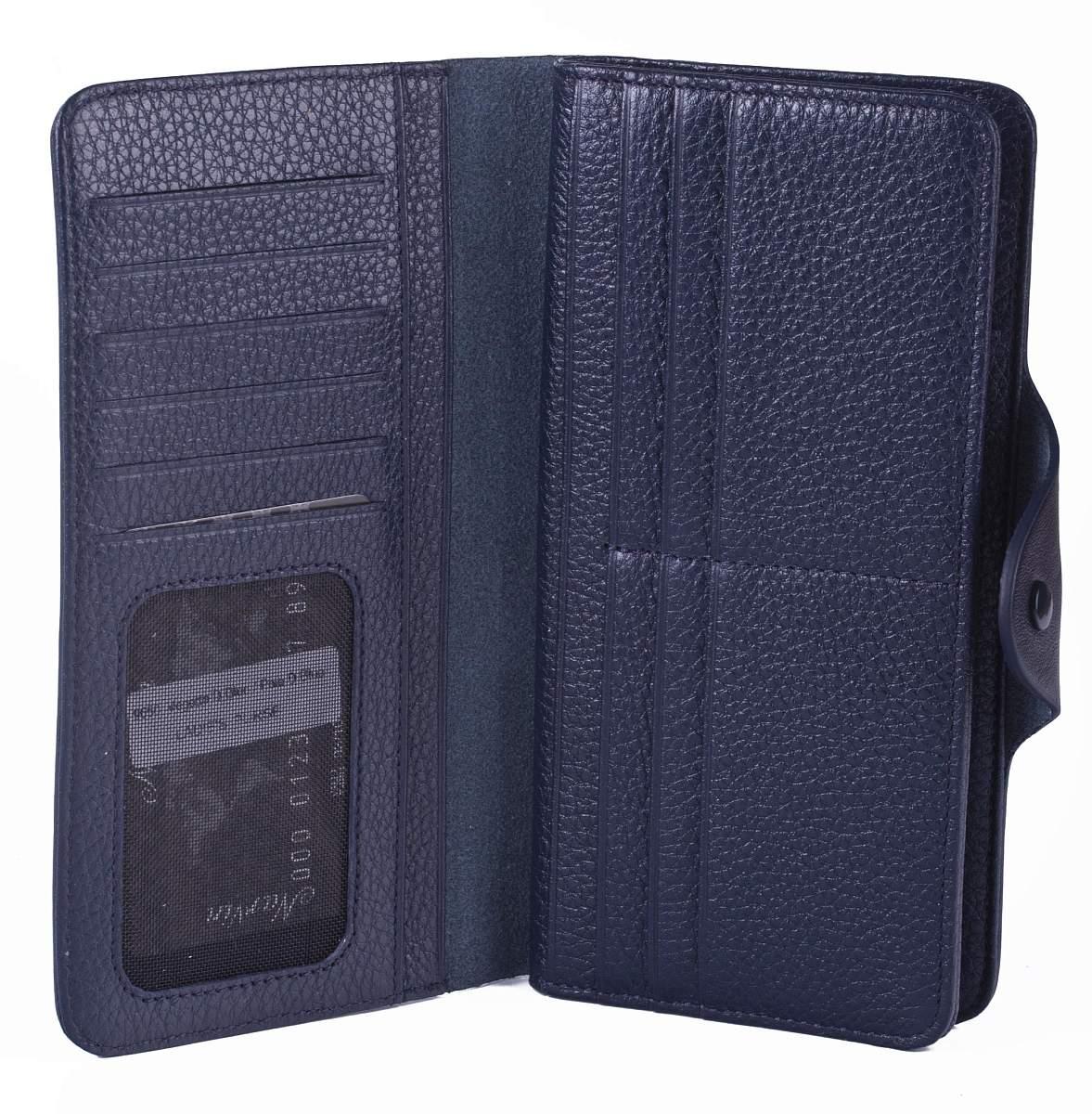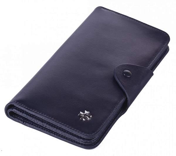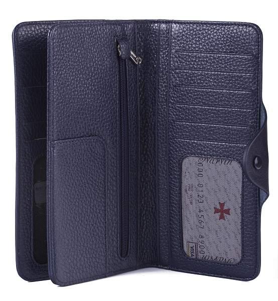 Мужское кожаное портмоне с хлястиком на кнопке. Внутри: отделения для банкнот, 2 окошка-сеточки, кармашки для кредитных карт, отделение для монет на молнии и дополнительные отделения.