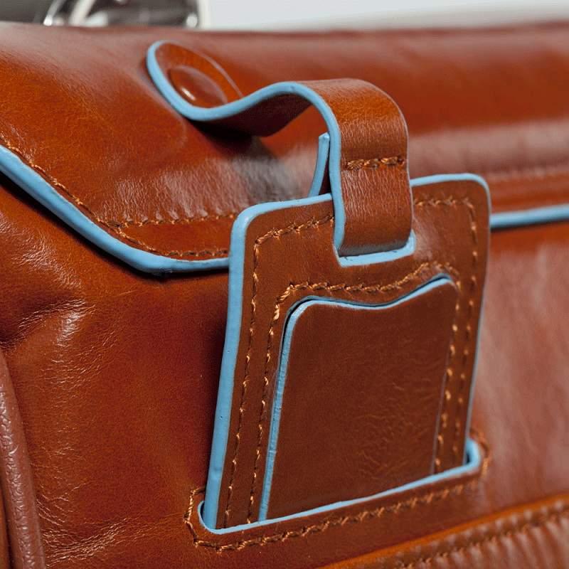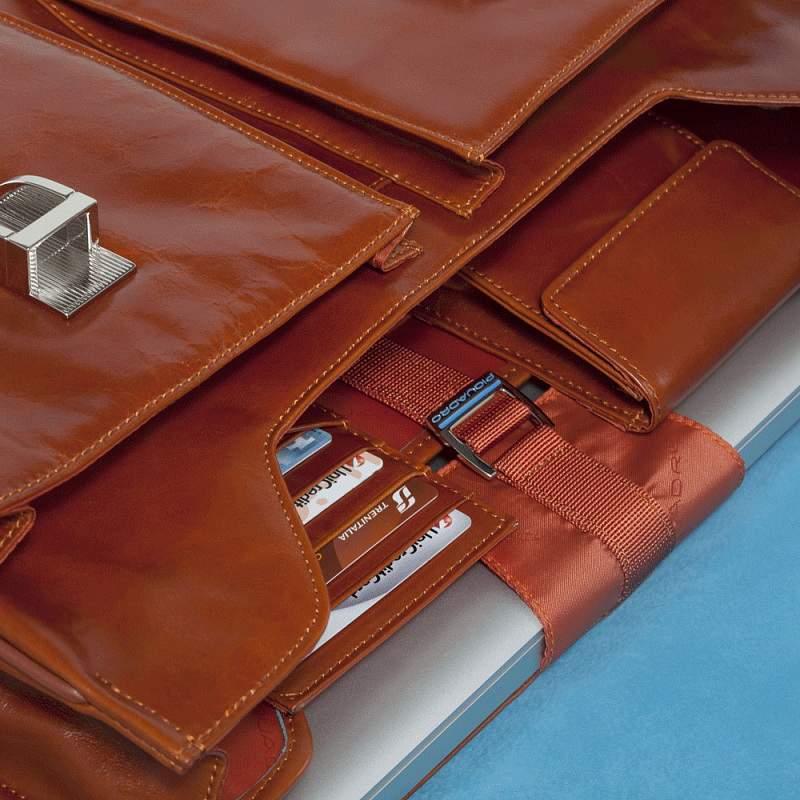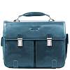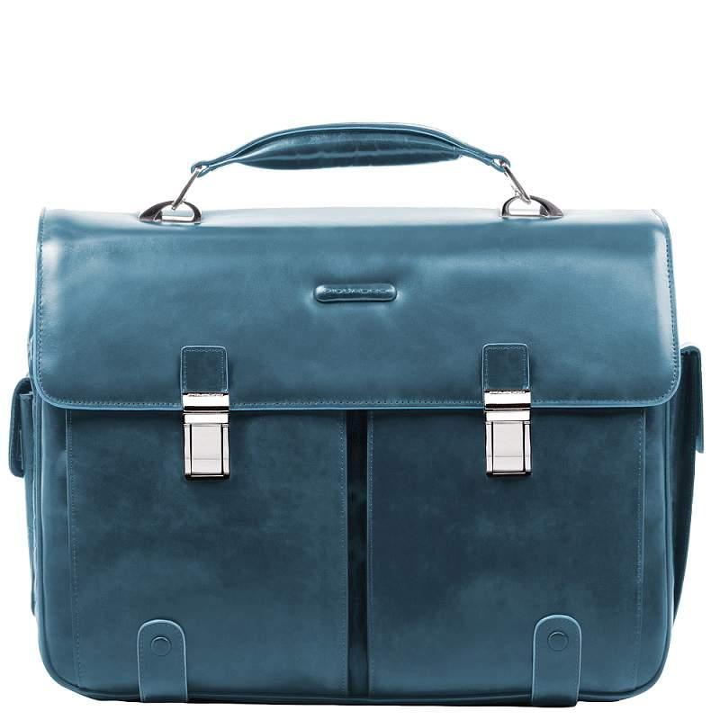 Портфель Piquadro выполнен из телячьей кожи и снабжен съемным плечевым ремнем. который регулируется по длине. Портфель закрывается широким клапаном с двумя замками. под которыми расположены карманы. Края портфеля отстрочены. клапан. ручки и язычки молний украшены голубым кантом. В центральной части расположена кожаная вставка с тиснением Piquadro. Два основных отделения дополнены съемными чехлами для банковских карт. телефона и ручек. отсеком для ноутбука (15 дюймов) с фиксацией и отделением для зонта. В задней части портфеля находятся широкий карман на молнии и крепления для багажной ручки. Прочный портфель удобен для использования как в повседневной жизни. так и командировках. Объемное внутреннее отделение и дополнительные карманы вмещают в себя все необходимые вещи и документы. Портфель упакован в фирменную коробку.