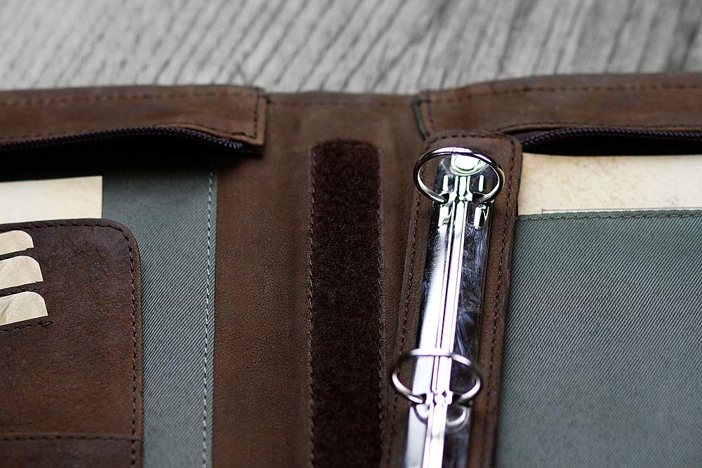 Внутренняя организация: основное отделение на молнии, 2 отделения для документов формата А4, держатель документов на 4 кольцах на липучке, 2 отделения, 2 держателя для ручек, 6 отделений для кредитных карт, 2 кармана на липучке, эластичная резинка для фиксации документов.