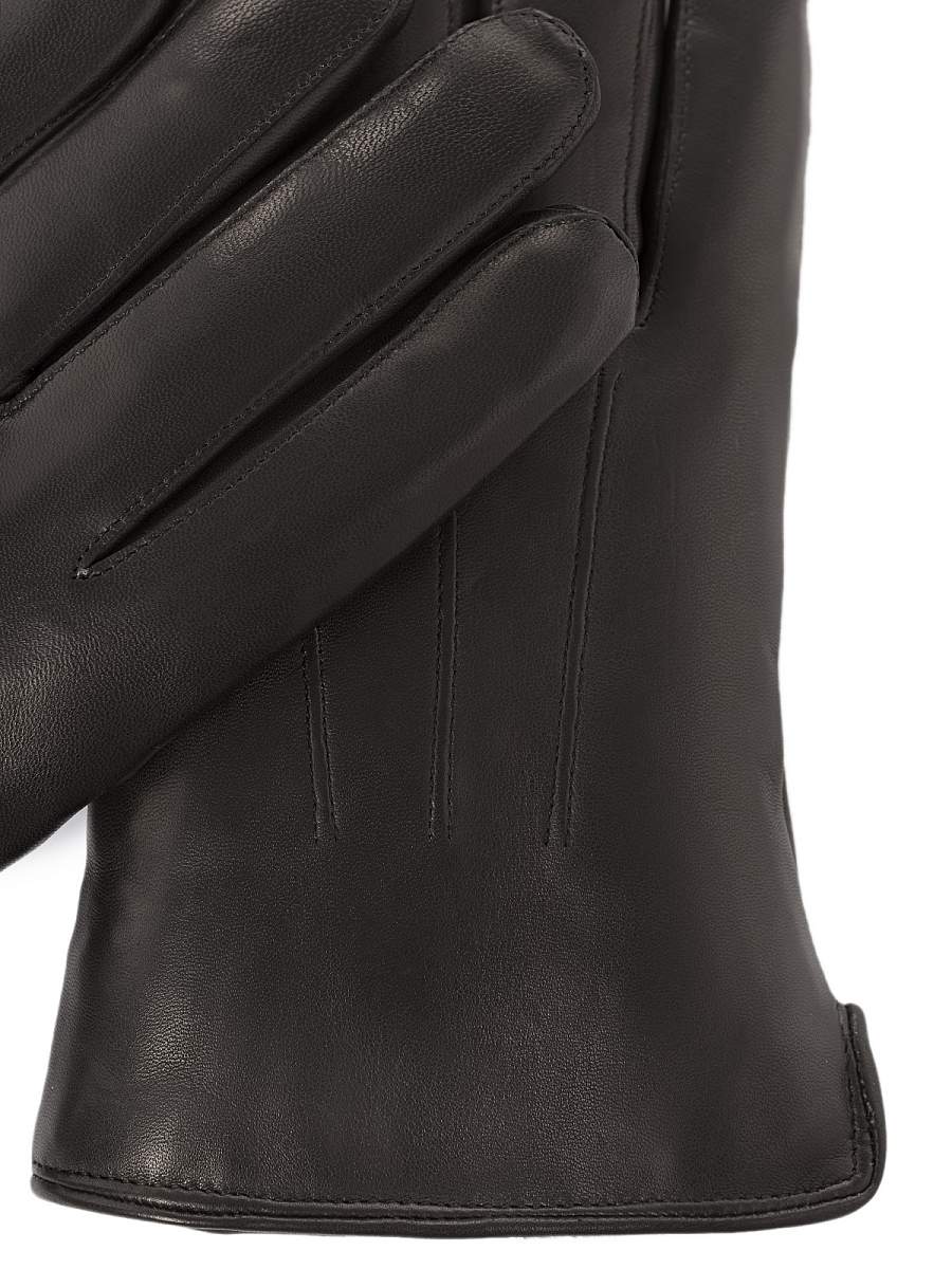 Перчатки торговой марки ELEGANZZA производства Китай, изготовлены из натуральной кожи черного цвета. Подкладка - мех (мутон). Отделка - декоративные швы "три луча". Длина манжета от нижней точки большого пальца до края перчатки составляет 5 см. Длина пальцев - средняя.