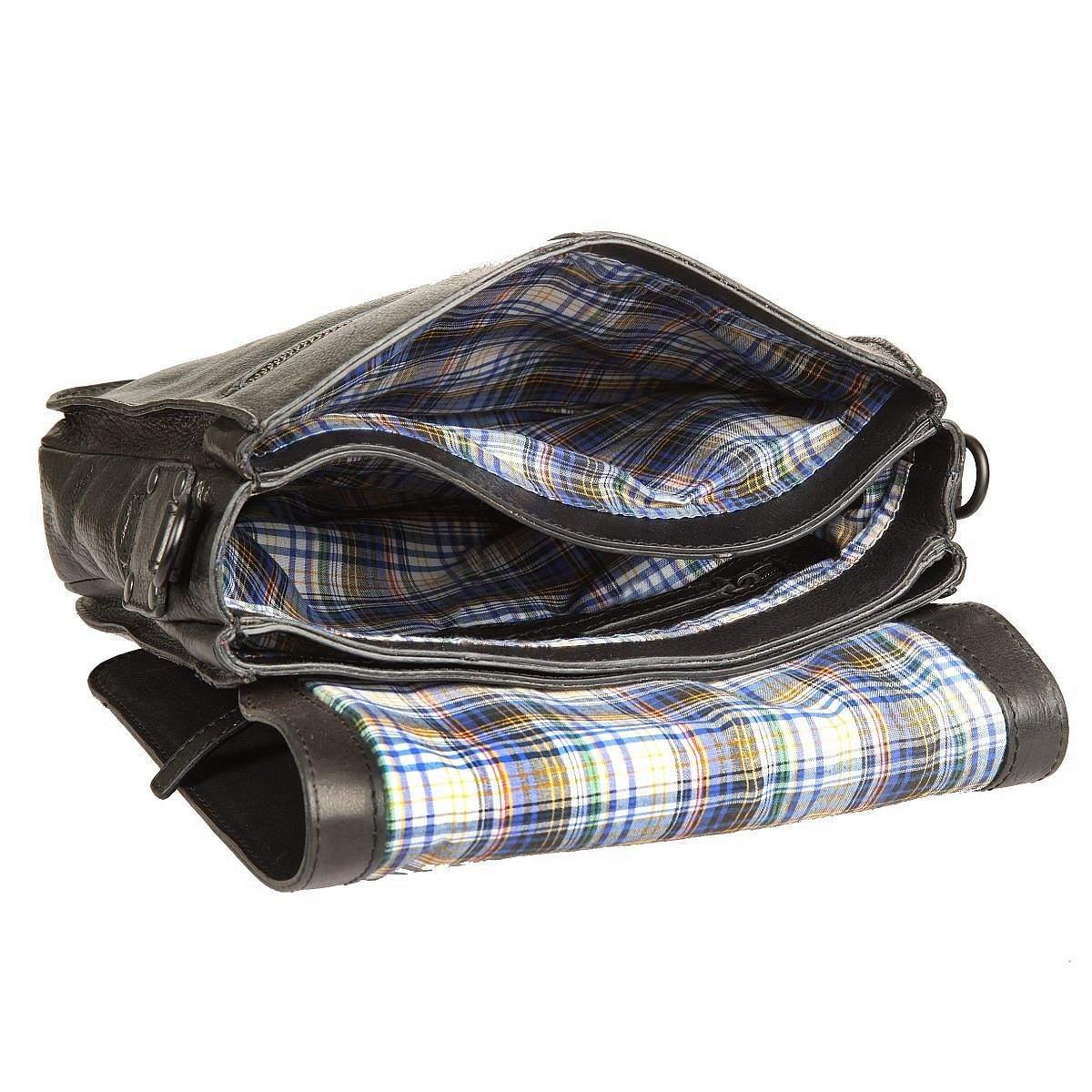 Внутри три отделения. В центральном отделении имеются карман на молнии, карман для мелких предметов и карман для мобильного телефона. Закрывается клапаном на кнопку. С внешней стороны на лицевой и задней стенках по карману на молниях. Планшет оснащён регулируемым плечевым ремнём.