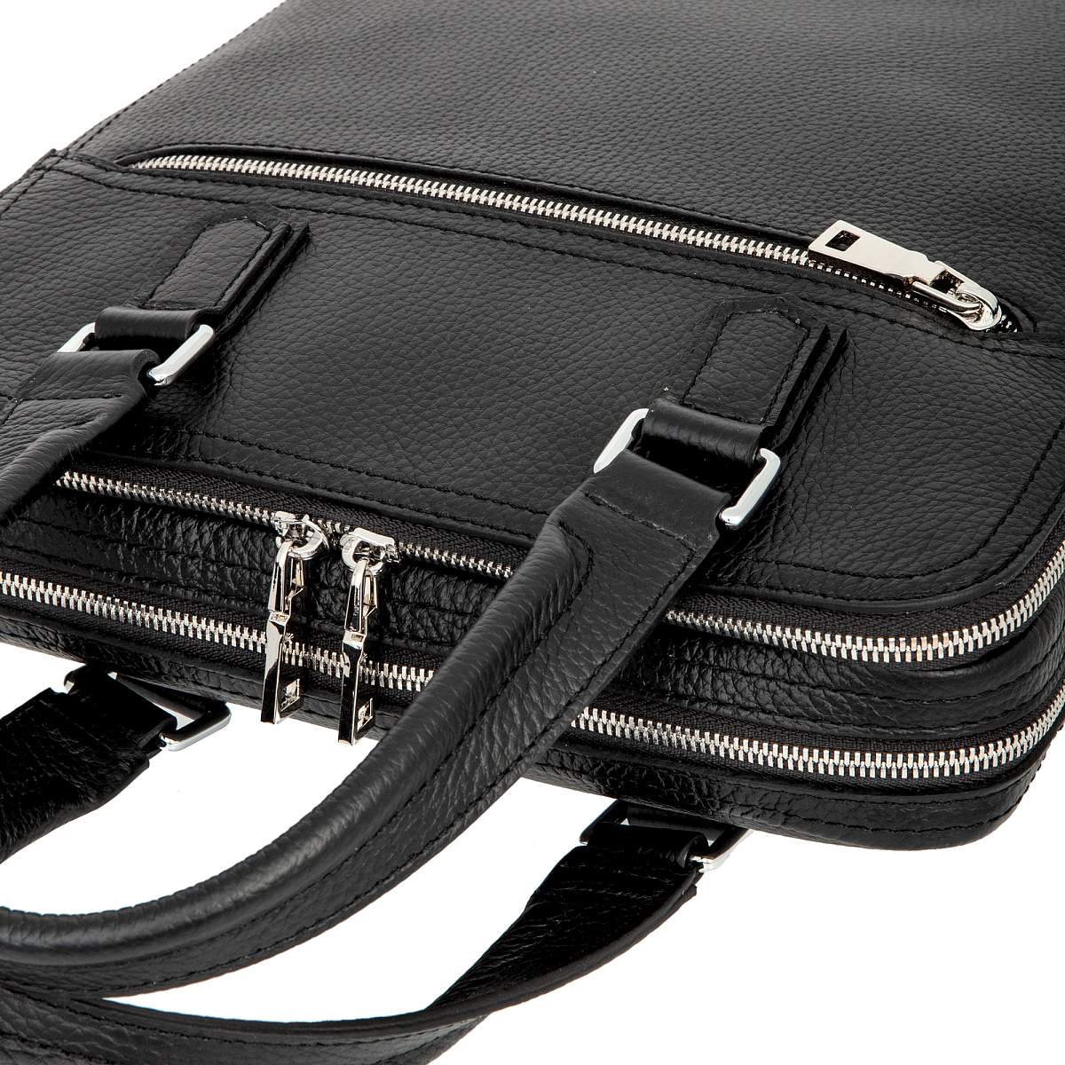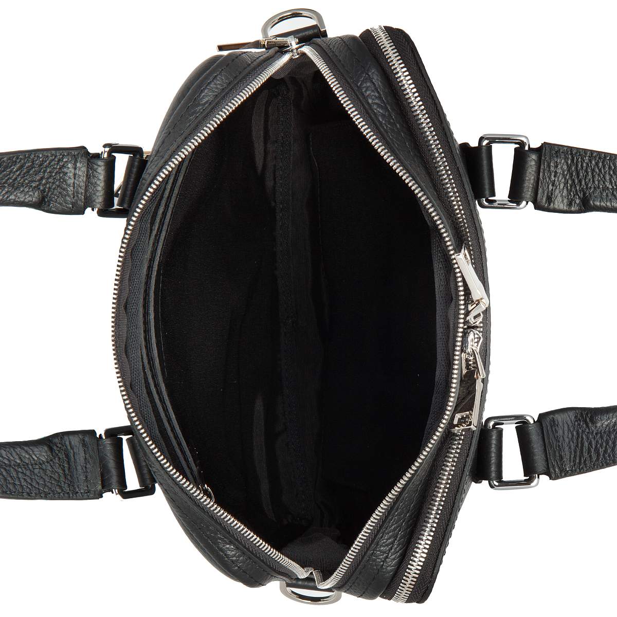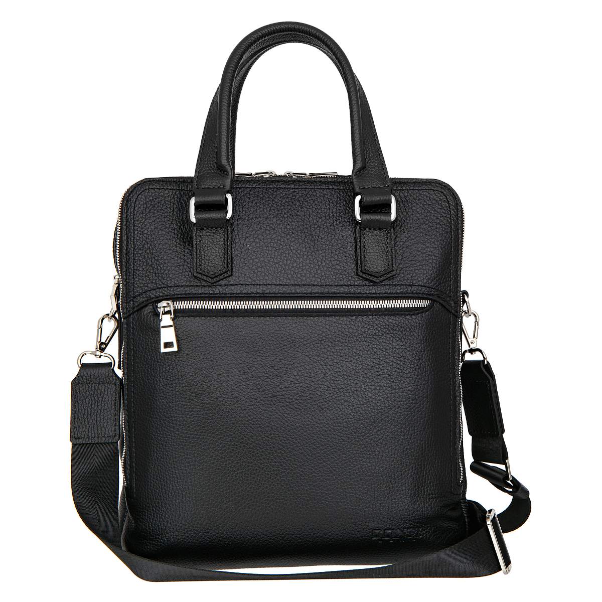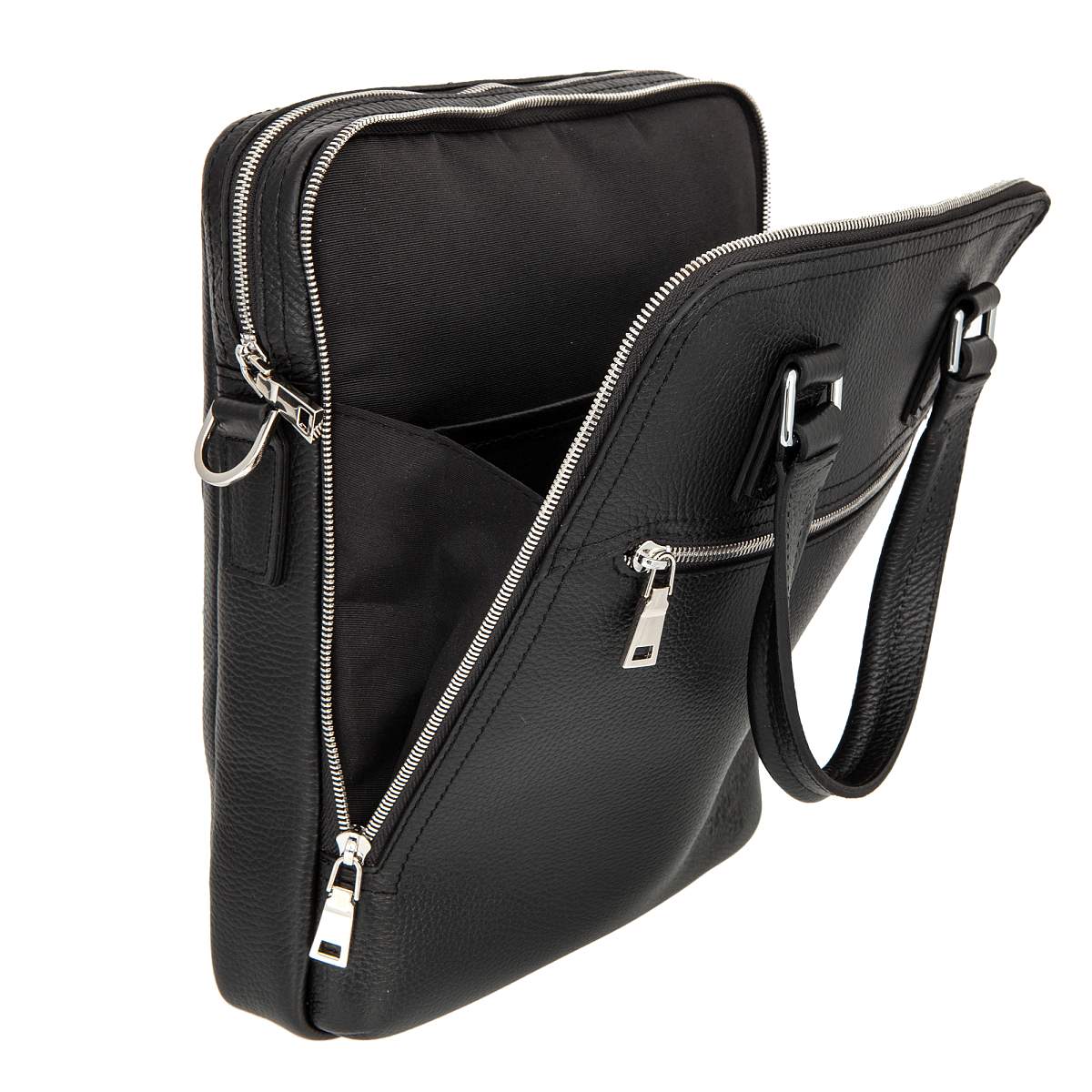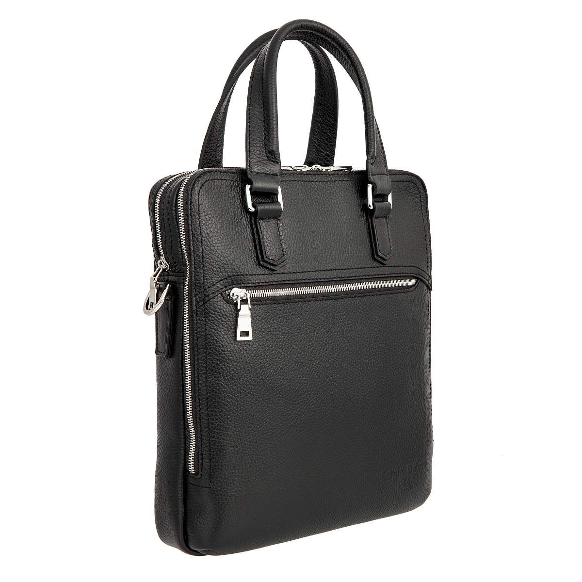 Мужская сумка чёрного цвета из мягкой натуральной кожи зернистой фактуры. Состоит из двух независимых отделений на молниях. Внутри карман на молнии, два кармашка для мелких предметов и отделение для планшета. Снаружи на лицевой и задней стенках карман на молнии. Планшет оснащён удобной верхней ручкой и съёмным регулируемым плечевым ремнём на карабинах. Цвет фурнитуры - серебро.
