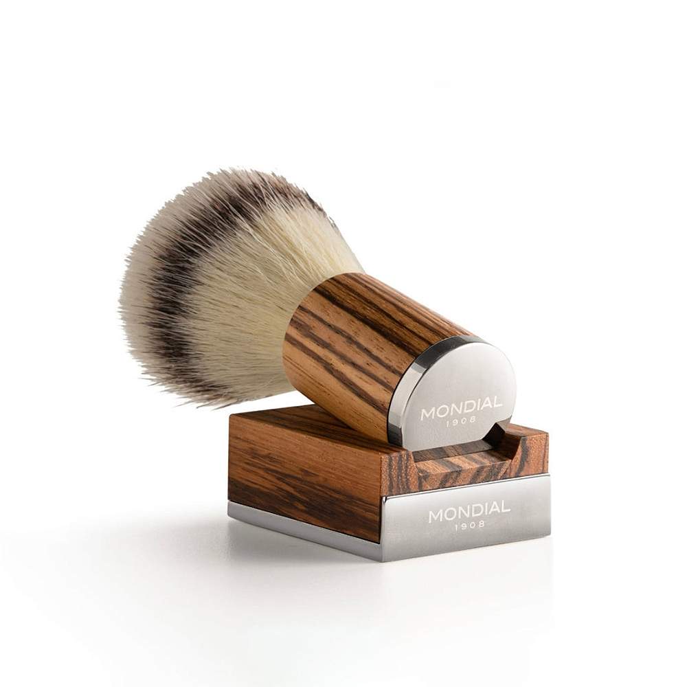Помазок для бритья с подставкой MONDIAL MYTHOS, зебрано, синтетический ворс KREX SILVERTIP, размер узла XL (24,5 мм)