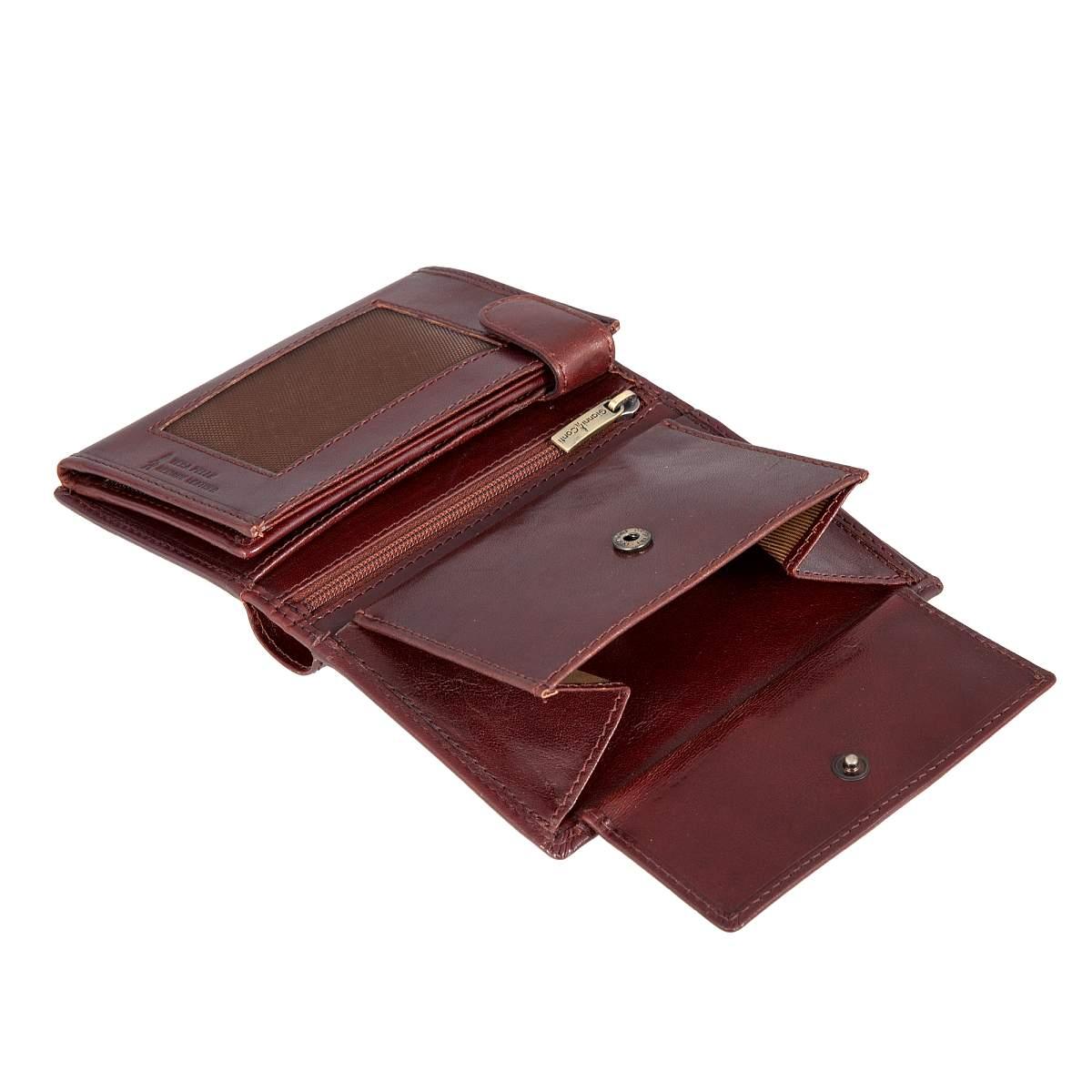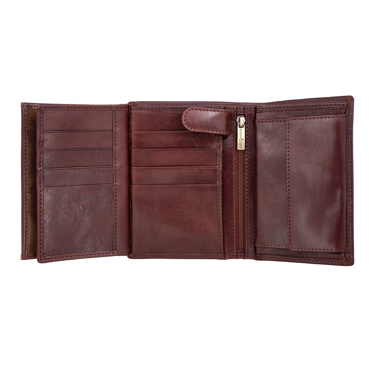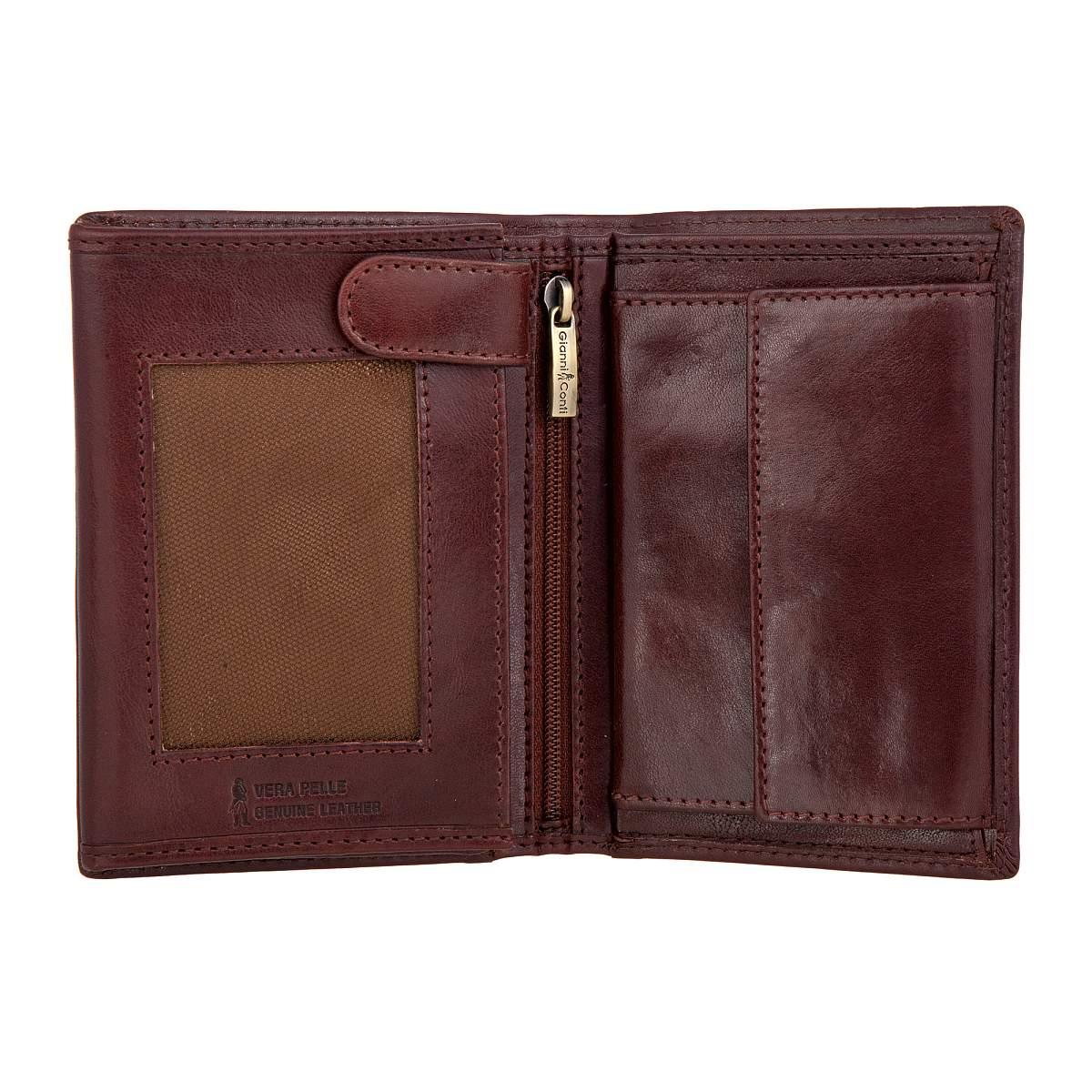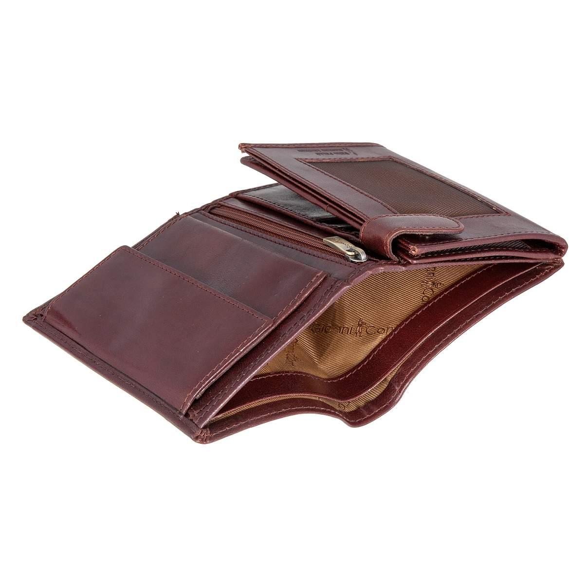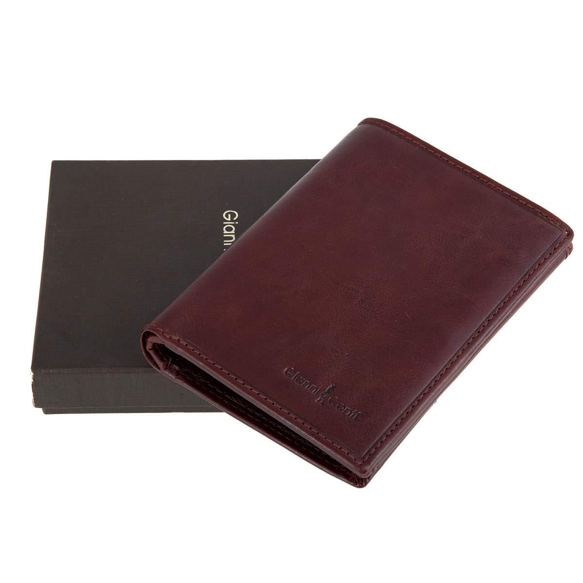 Функциональное портмоне из натуральной кожи. Внутри 2 отделения для купюр, карман для монет на кнопке, карман для документов на молнии. 3 потайных кармана, 2 сетчатых кармашка, 8 кармашков для пластиковых карт. Товар упакован в подарочную коробку от бренда Gianni Conti. Размеры: 13,5 х 10 х 3 см.