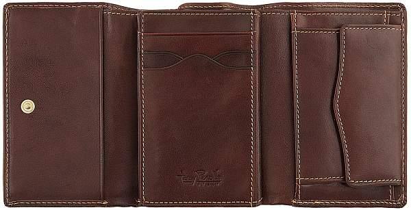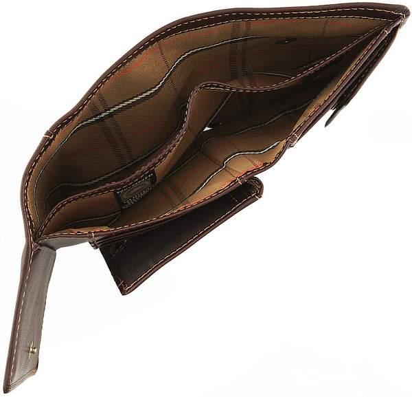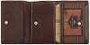 Две секции для банкнот, множественные отделения для кредитных карт, внутри монетница на кнопке, прозрачное отделение для проездных документов на кнопке. Кошелек закрывается внутри на кнопку.