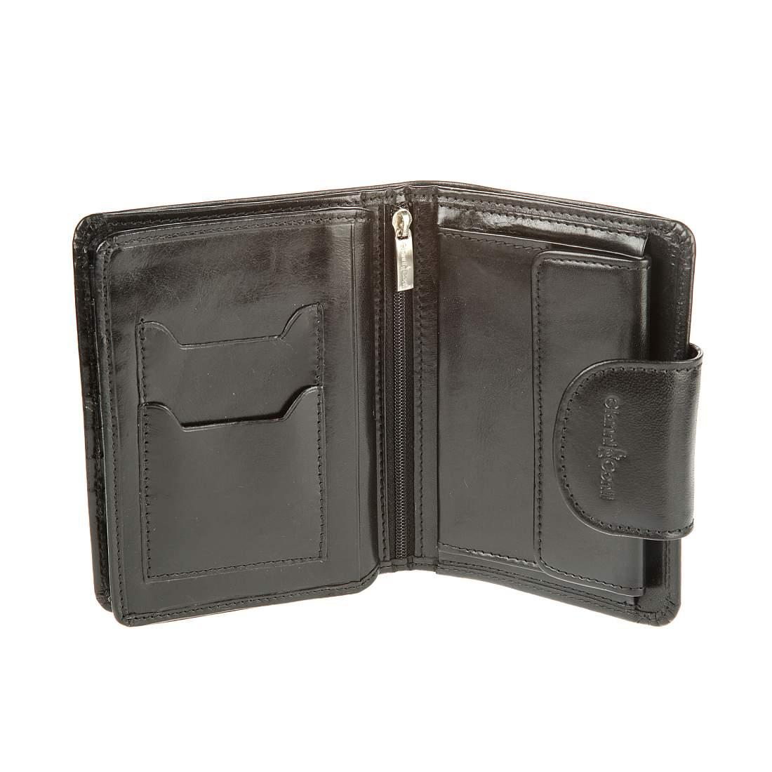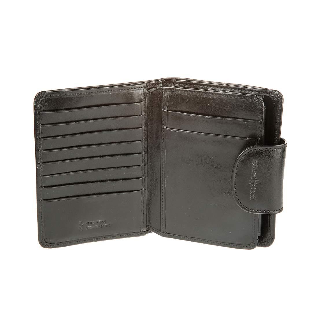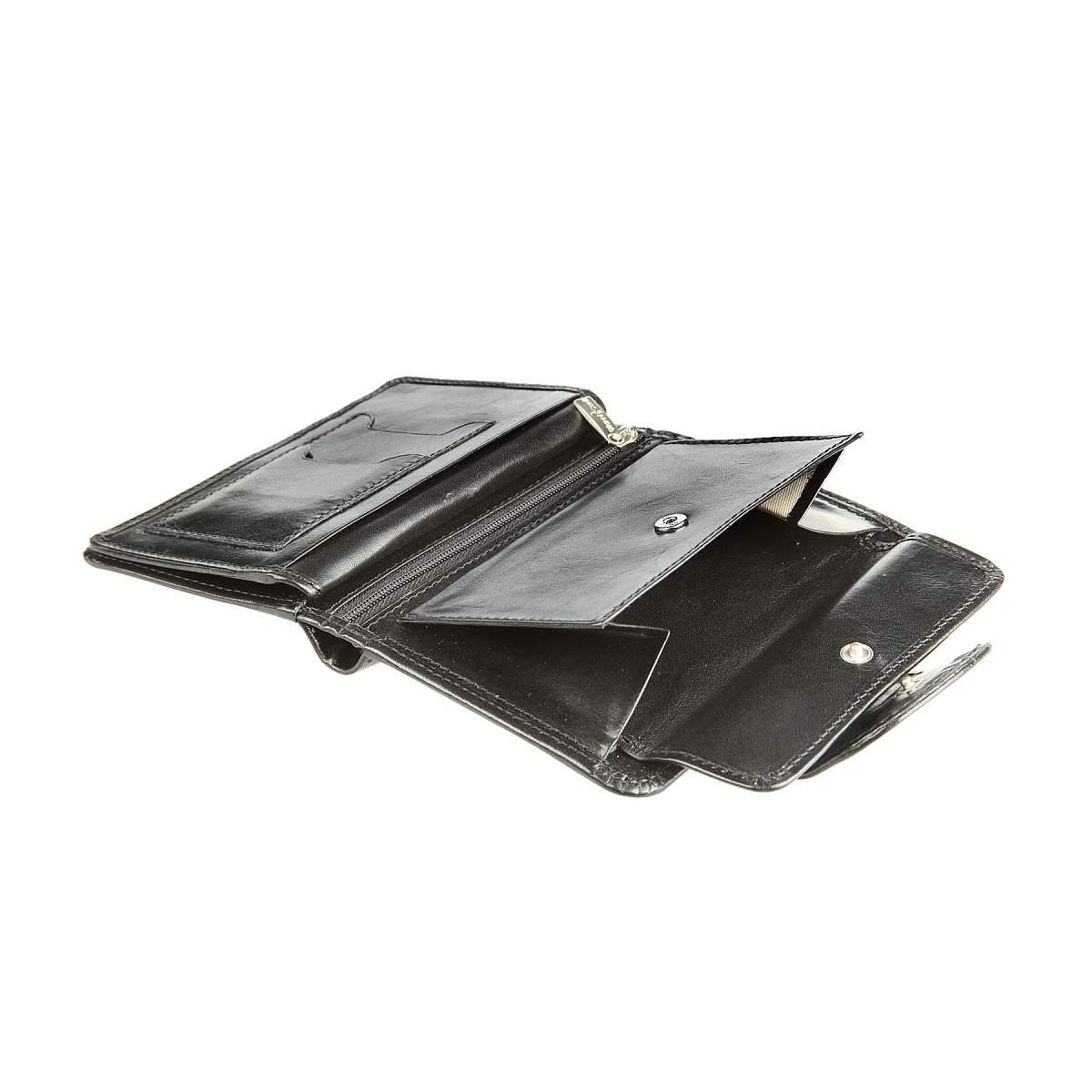 Внутри два отделения для купюр, карман для монет на кнопке, карман для документов на молнии, три потайных кармана, два кармана для документов и двенадцать кармашков для пластиковых карт. Закрывается клапаном на кнопке.