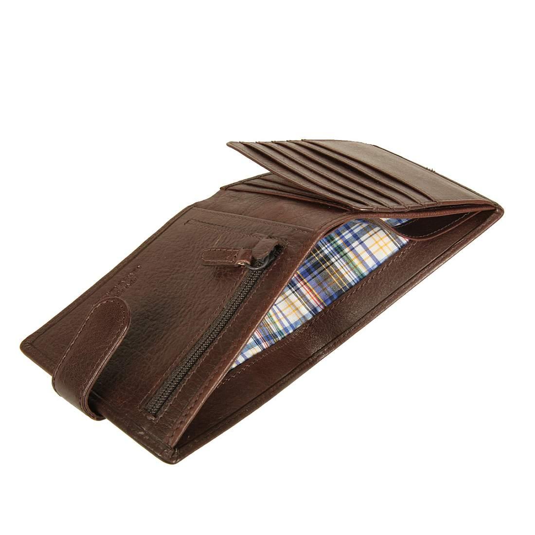 Внутри портмоне два отделения для купюр, карман для монет на молнии, два потайных кармана, сетчатый карман и десять кармашков для пластиковых карт. Закрывается клапаном на кнопке.