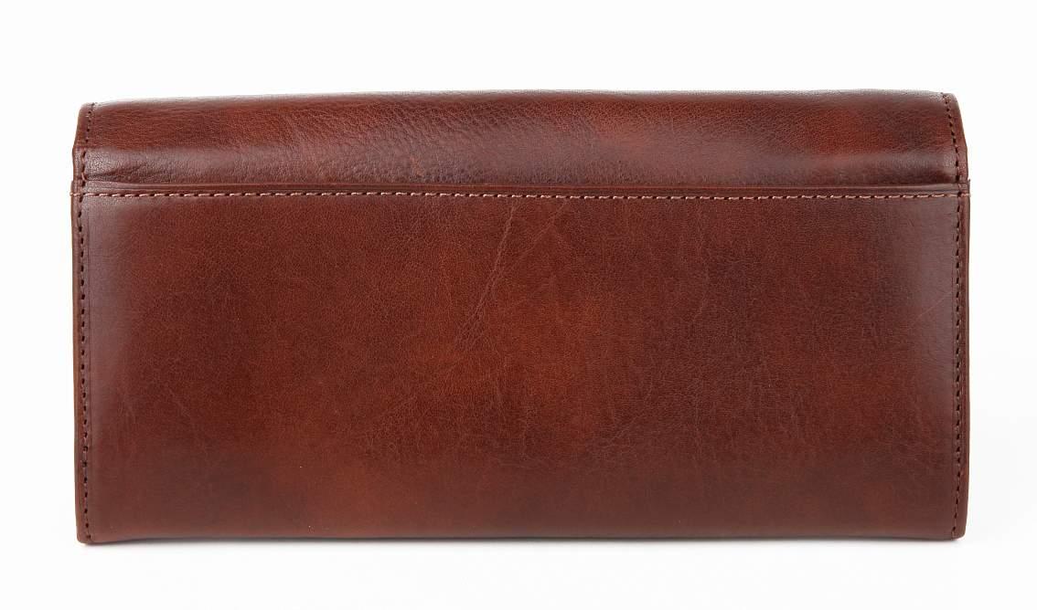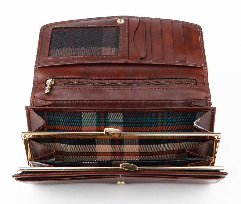 Женский кошелек из натуральной кожи. Внутри две автономных секции для банкнот, 10 отделений для карт, отделение для проездного или пропуска, потайное отделение на молнии, объемная монетница на защелке-поцелуйчике. Снаружи с обратной стороны имеется карман. Изящная округлая крышка.