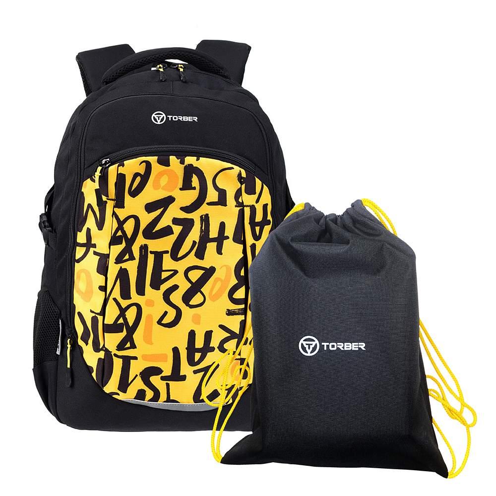 Рюкзак TORBER CLASS X, черно-желтый с принтом, 46 x 32 x 18 см + Мешок для сменной обуви в подарок! T9355-22-BLK-YEL-M