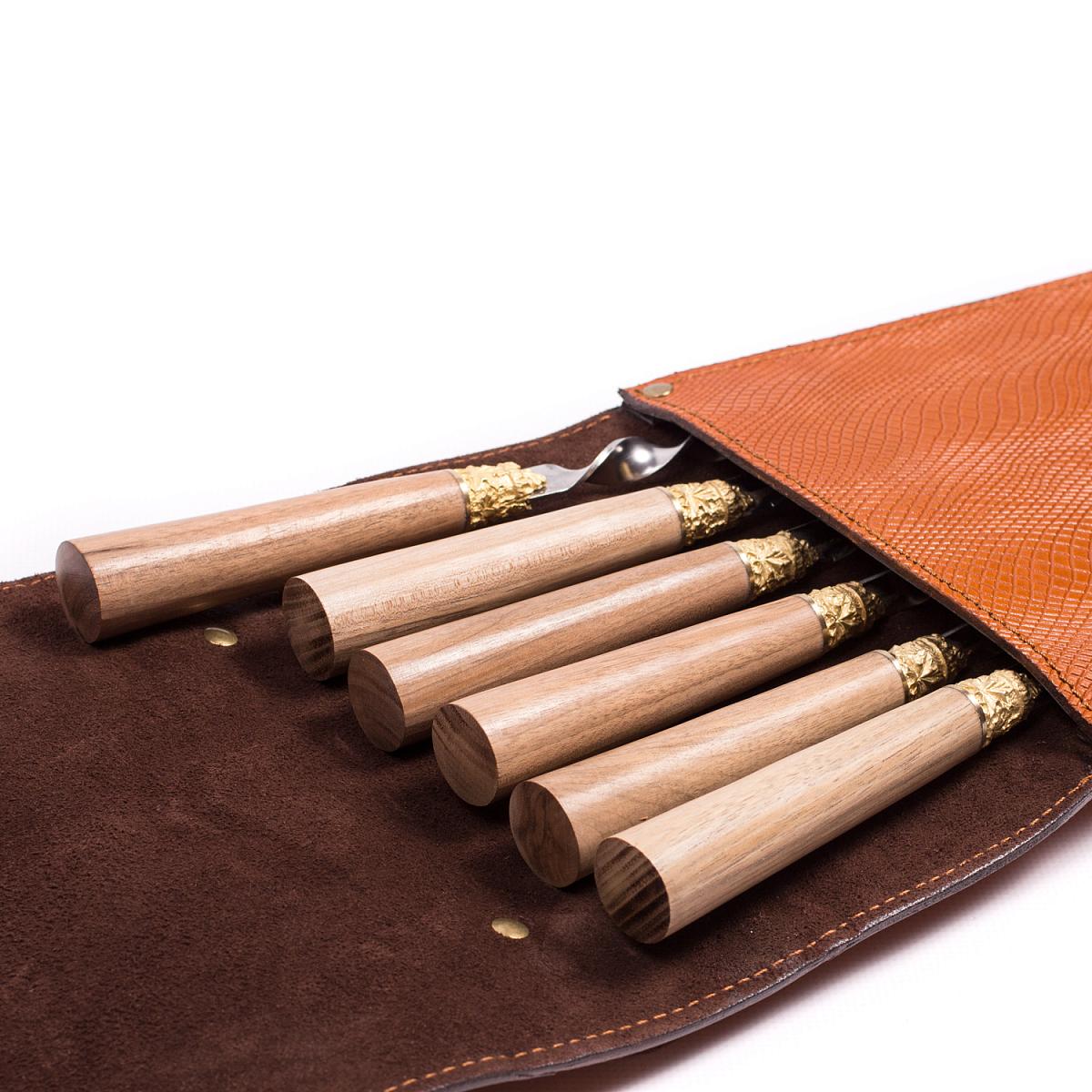 - Шампур с рукоятью из ореха и латуни (общая длина шампура — 67 см: длина полотна — 54 см, длина рукояти — 13 см) - 6шт.