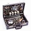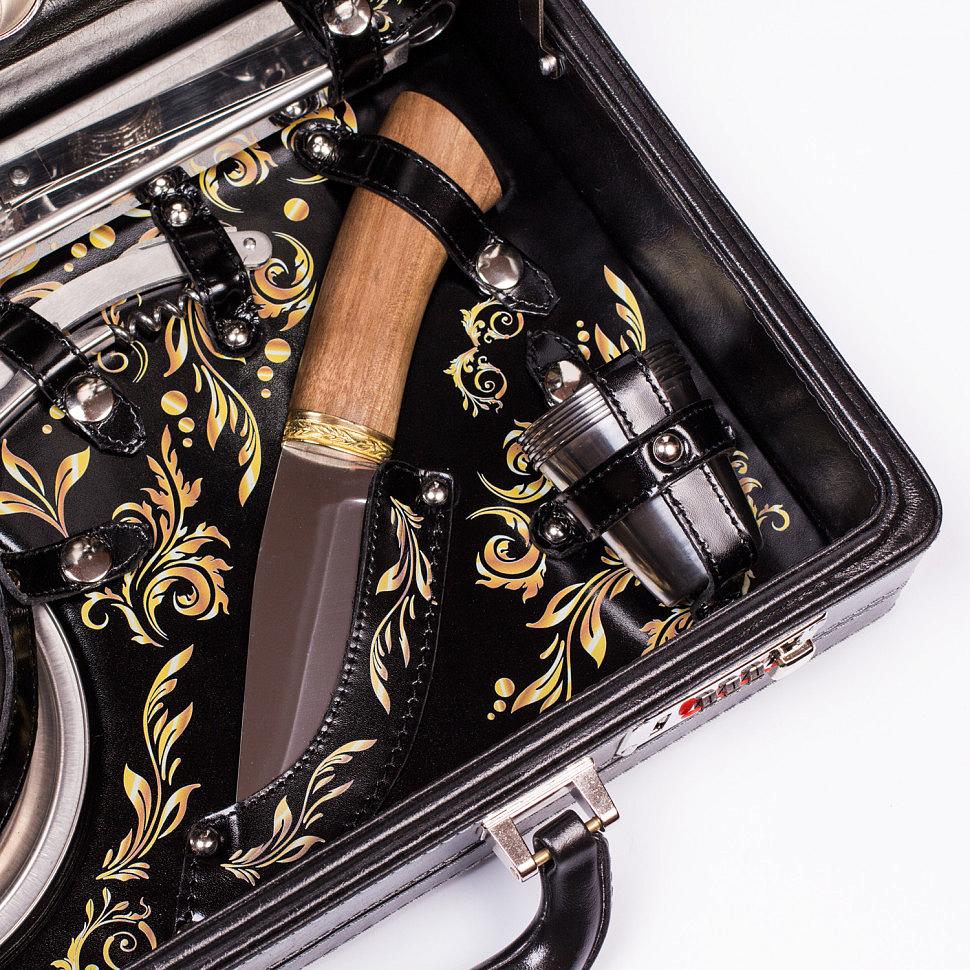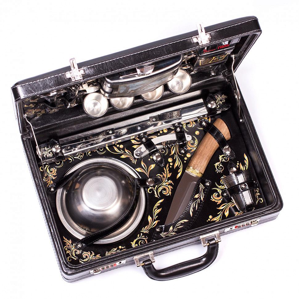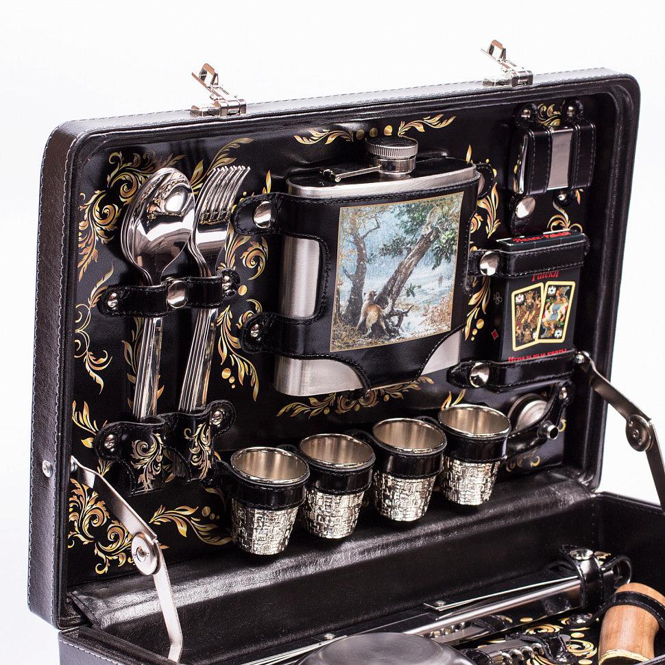 Подарочный набор для пикника на 4 персоны в красивом кейсе из кожзаменителя с внутренней отделкой из натуральной кожи и росписью ручной работы. Прекрасный, дорогой и оригинальный подарок.