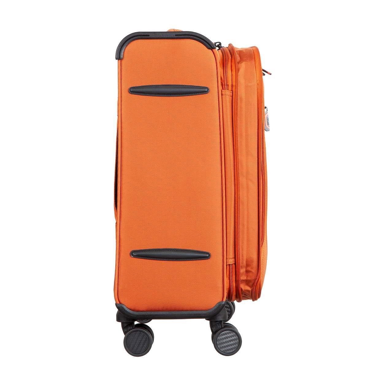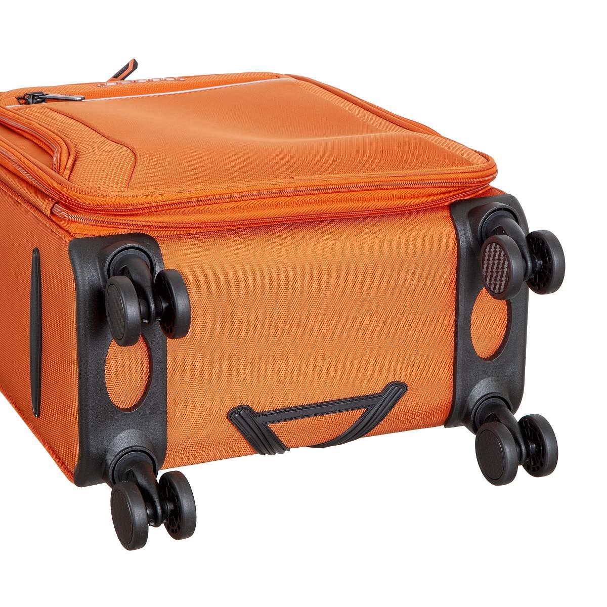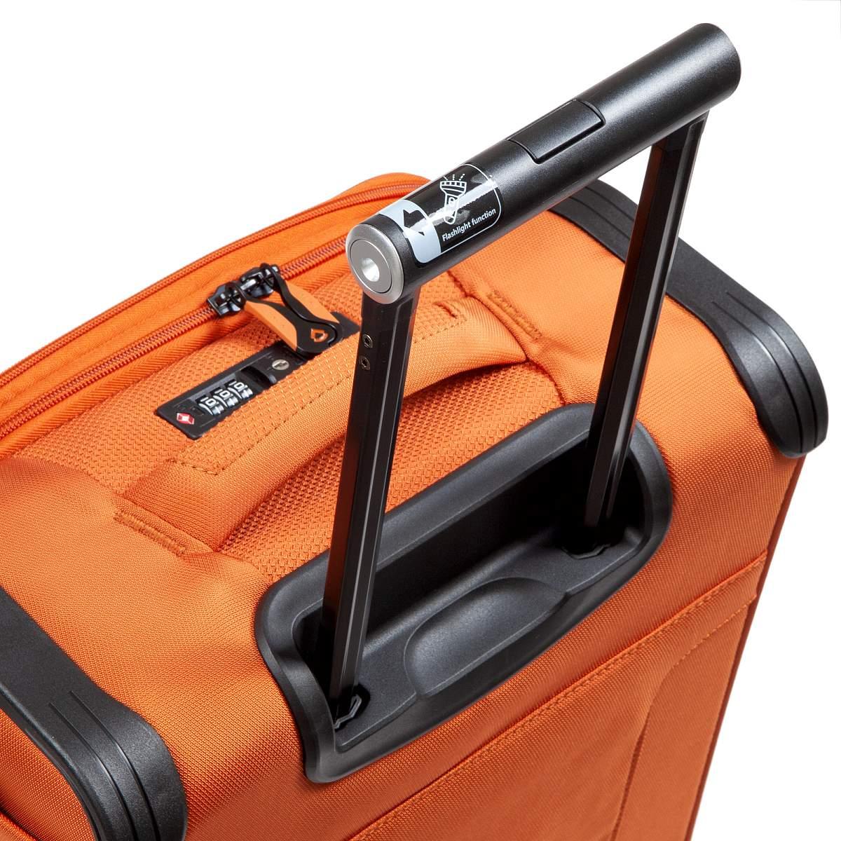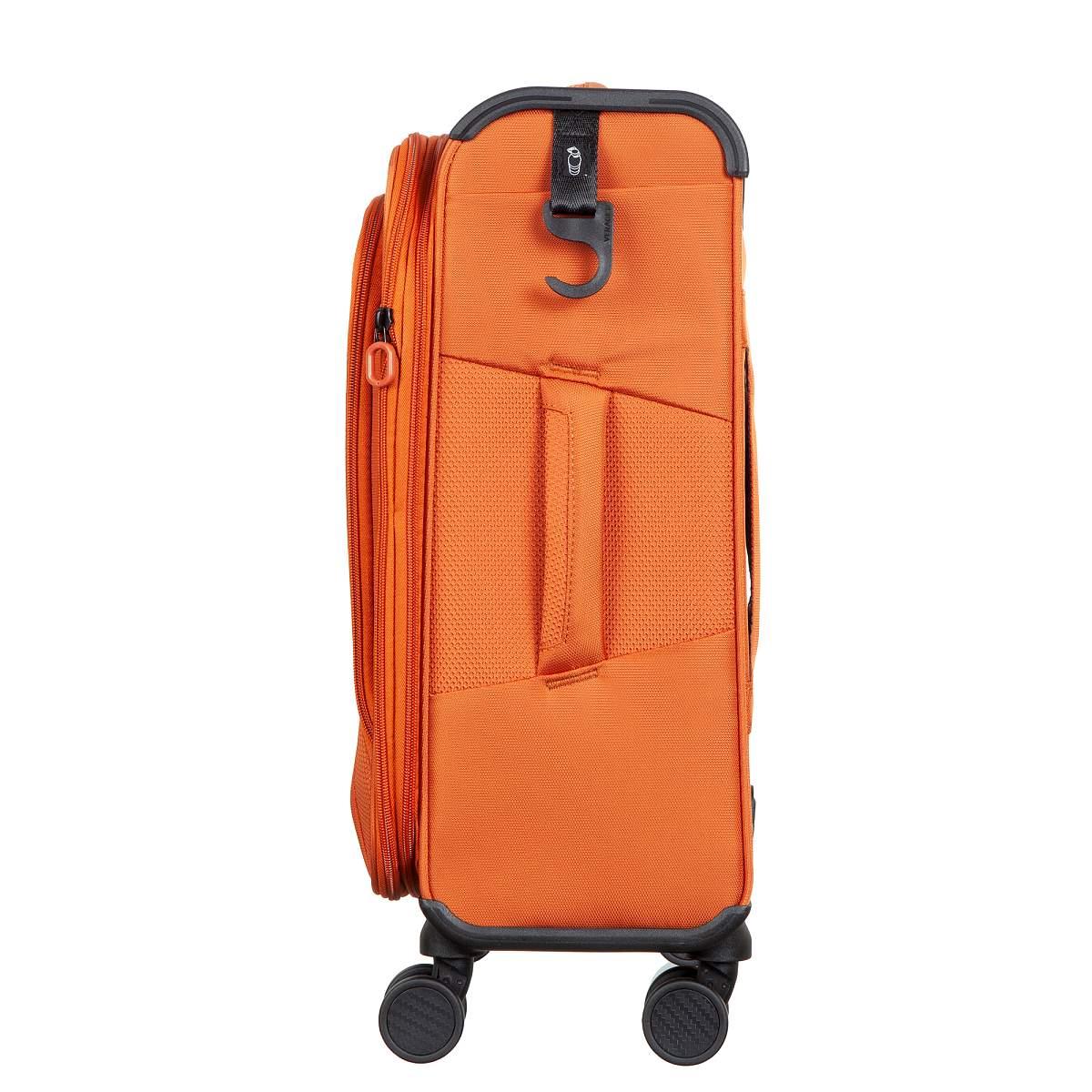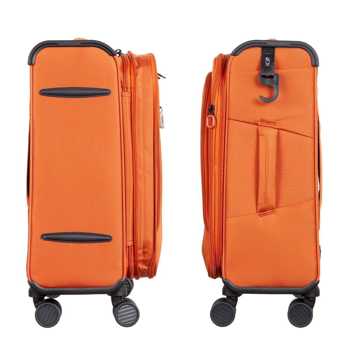Чемодан из полиэстера оранжевого цвета. Коллекция: Verage «Toledo». Выполнен из полиэстера, устойчив к царапинам и воде. Чемодан оснащён двойной молнией безопасности, что препятствует вскрытию багажа. Внутри вместительное отделение с внутренним глубоким карманом и регулируемыми прижимными ремнями, с возможностью увеличения объёма чемодана за счёт молнии до 4 см.(функция невидимого расширения). Чемодан оснащён выдвижной телескопической ручкой с фиксатором и регулировкой в 4-х положениях, в ручке расположен фонарик с 3-мя режимами регулировки света. Также чемодан оснащён мягкой верхней ручкой для удобного подъёма и временной переноски, бесшумными 8-спиннерными колёсами с поворотом на 360°, что обеспечивает лучший баланс и лёгкое скольжение. Чемодан закрывается кодовым замком TSA. Снаружи на передней панели расположен большой карман и карман на молнии для билетов или мелких предметов. На задней стенке крепление на ручку чемодана, что даёт возможность зафиксировать чемодан поверх другого багажа. На боковой стенке карман и крючок для крепления питьевой бутылки. Размер: 19 (S). Вес: 2,640 кг.