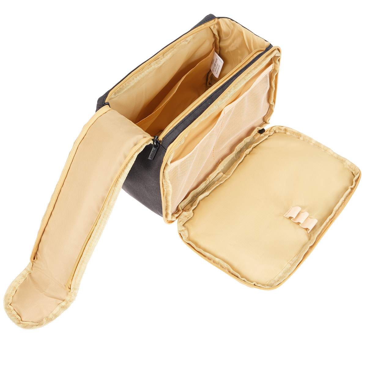 Несессер выполнен в прямоугольной форме, центральное отделение имеет клапан на молнии с двух сторон и магнитной кнопкой на конце. На внешней стороне расположено дополнительное отделение на молнии и включает в себя два сетчатых кармана и три эластичных держателя для мелких предметов.