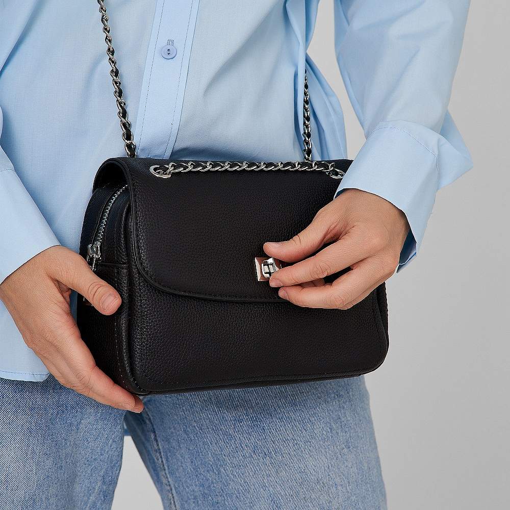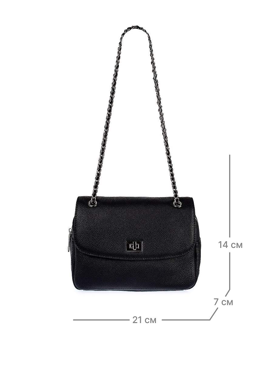 Стильная женская сумка кросс-боди выполнена из натуральной зернистой кожи. Габариты сумки через плечо (ВхШхГ) 14х21х7 см. Сумка через плечо с подкладом из полиэстера в мягком каркасе. Под клапаном на замке одно вместительное отделение закрывается на молнию, в котором расположены 2 кармана на молнии и два открытых кармана. С внешней стороны карман на магните. Сумка легкая и вместительная, чтобы самые нужные вещи всегда были под рукой. Несъемный плечевой ремень-цепочка регулируется по длине от 64 до 114 см. Фурнитура выполнена из металла под серебро. Сумка с застежкой поставляется в текстильной (пыльник) и полиэтиленовой упаковке, что защищает ее от повреждений, а также позволяет удобно хранить женскую сумочку в дальнейшем использовании.