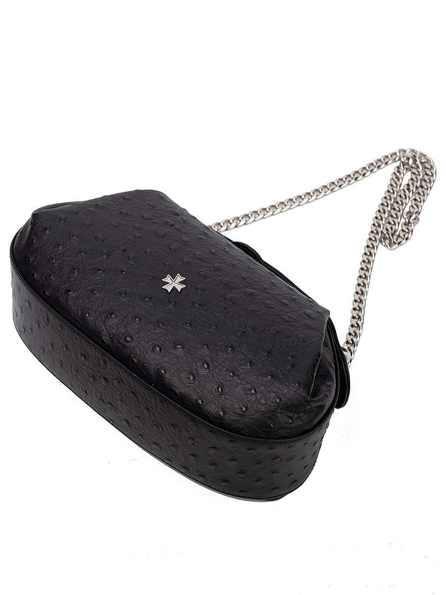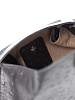 Сумка закрывается на магнит, внутри есть одно большое отделение. В комплекте идёт съёмный кожаный ремень длиной 120 см для ношения на плече или через плечо. Также имеется съёмная ручка-цепочка длиной 80 см. Для ухода за сумкой в наборе есть фирменный мешок на кулиске.