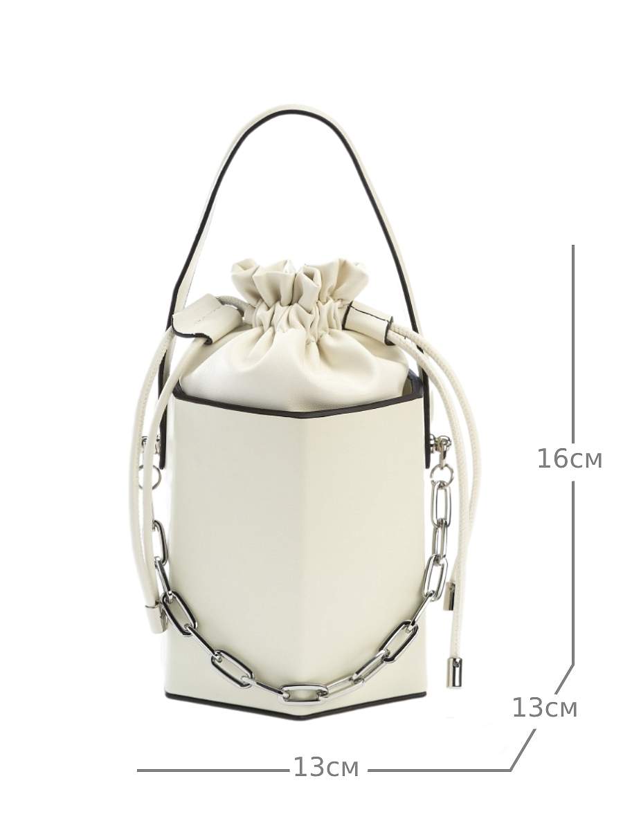 Стильная сумка кроссбоди в оригинальной форме с жестким каркасом из гладкой натуральной кожи не оставит Вас без внимания. Верх модели выполнен из мягкой натуральной кожи в форме мешочка, вшитого в сумку. Подклад из искусственной замши. Габариты сумки через плечо -( ВхШхГ) 16х13х13 см. Сумка-ведро декорирована ручкой из кожи и металлической цепочкой, длина 35 см. В комплекте кожаный плечевой ремень, регулируется по длине до 120 см. и позволяет носить сумку на плече или через плечо , как кросс-боди. Фурнитура выполнена в серебристом цвете. Сумка поставляется в текстильной (пыльник) и полиэтиленовой упаковке, что защищает ее от повреждений, а также позволяет удобно хранить женскую сумочку в дальнейшем использовании.