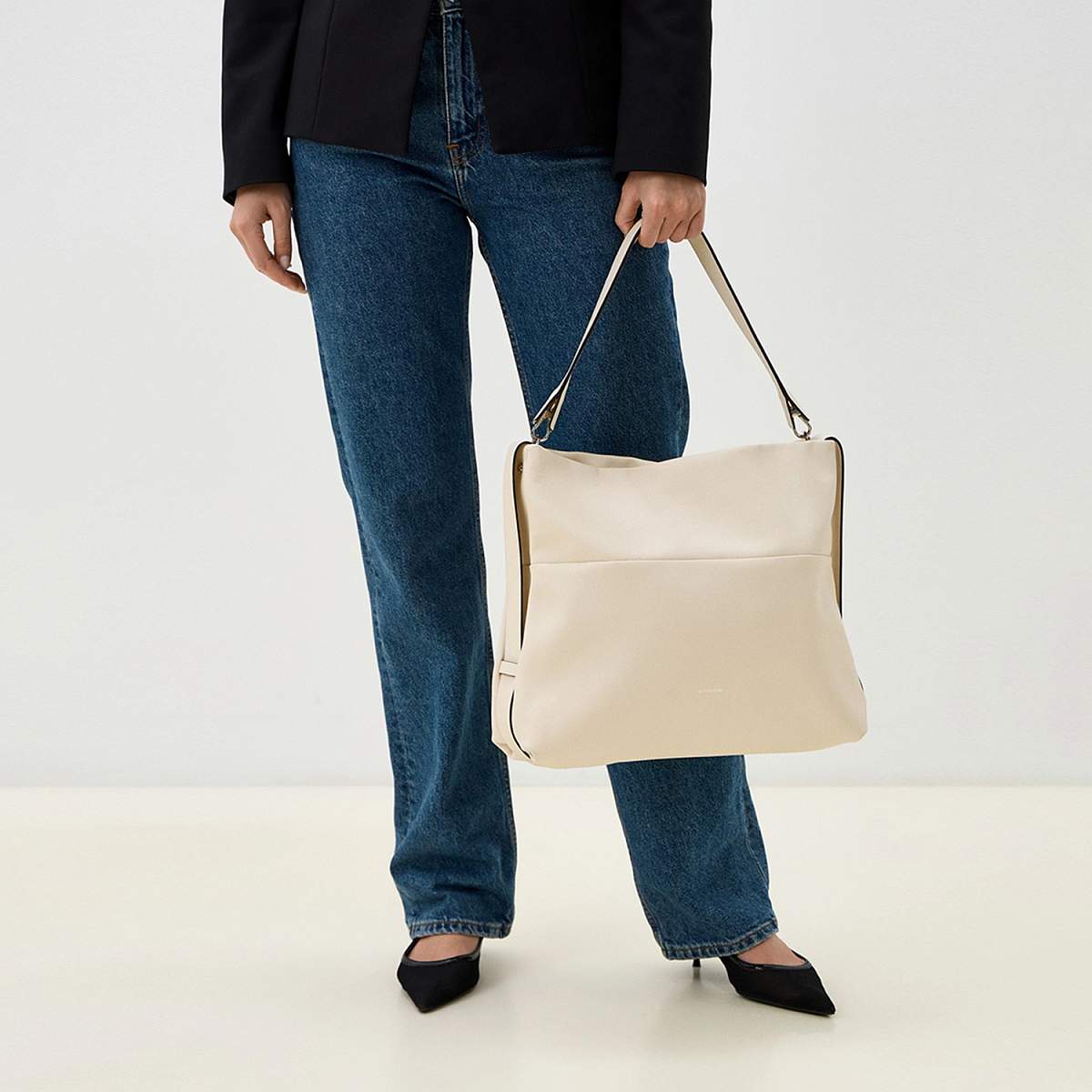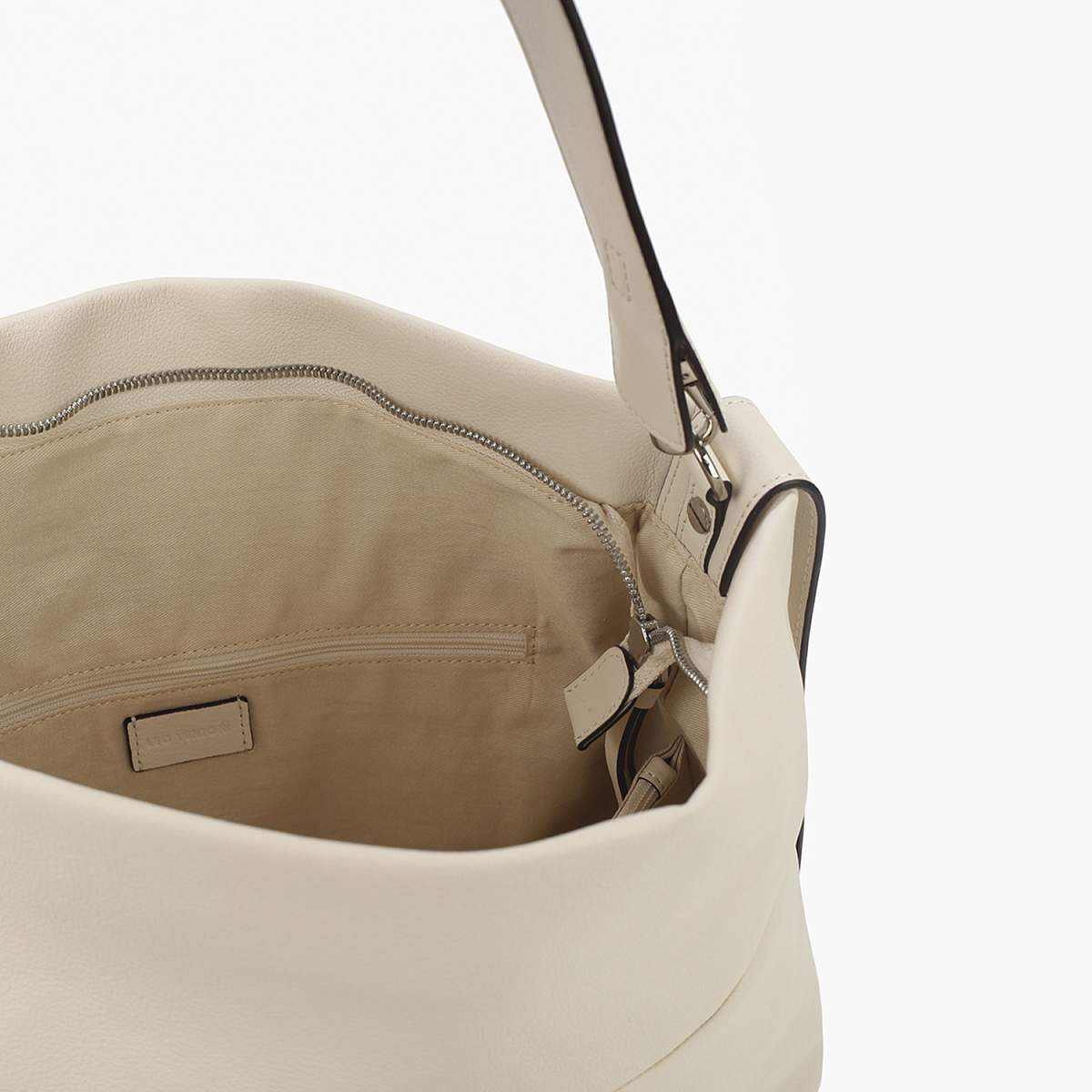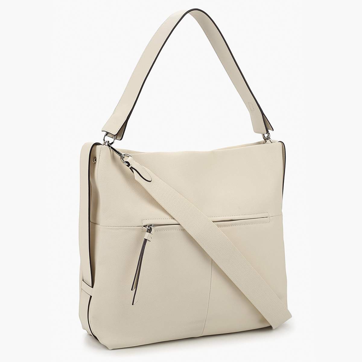 Большая сумка-хобо LEO VENTONI в светло-бежевом цвете выполнена из натуральной зернистой кожи. Сумка закрывается на молнию с удлиненным кожаным поводком. Внутри 2 отдела, разделенные карманом на молнии, и 2 кармана для мелочей: открытый и на молнии. Подкладка - из натурального хлопка. На тыльной стороне предусмотрен карман быстрого доступа на молнии. В комплекте 2 съемных плечевых ремня: длина одного - 55 см, ширина - 3 см; второй ремень текстильный, регулируется по длине, ширина - 3,5 см. Цвет фурнитуры - серебро.