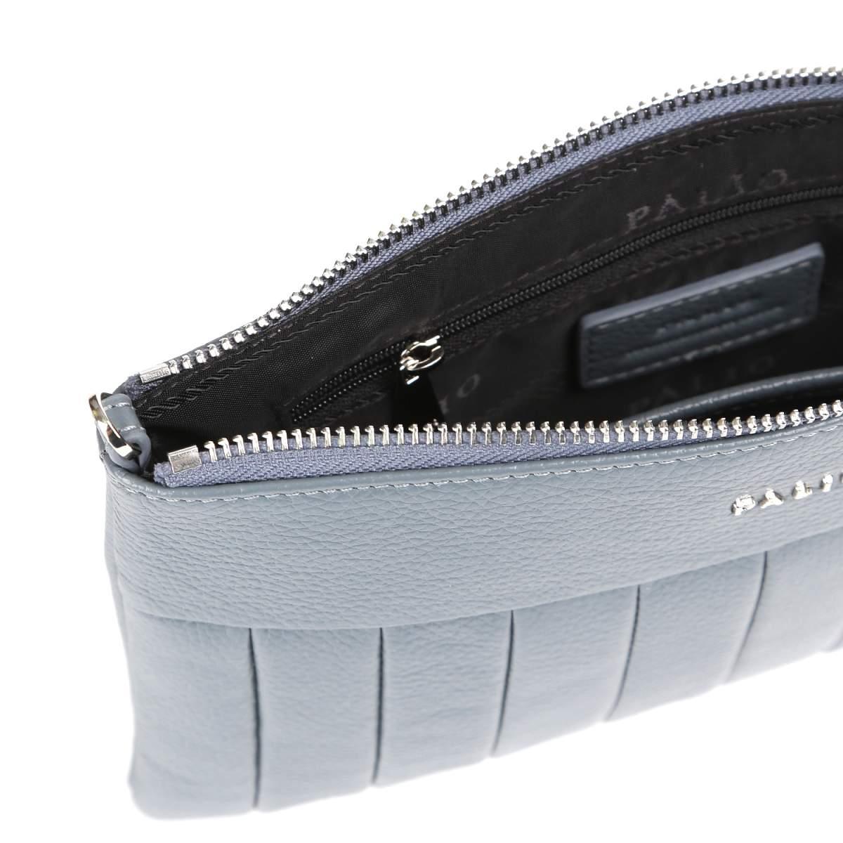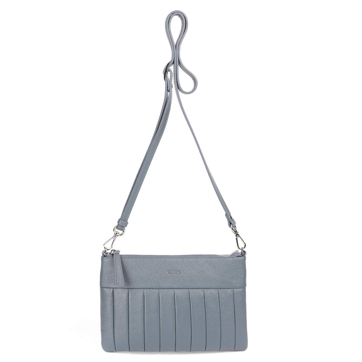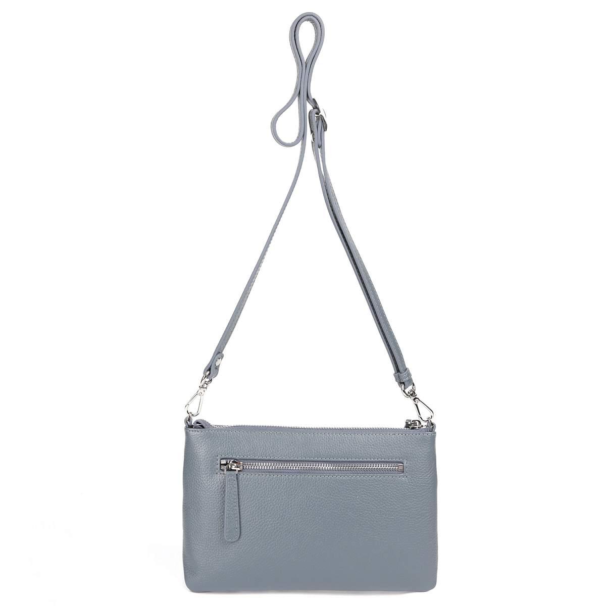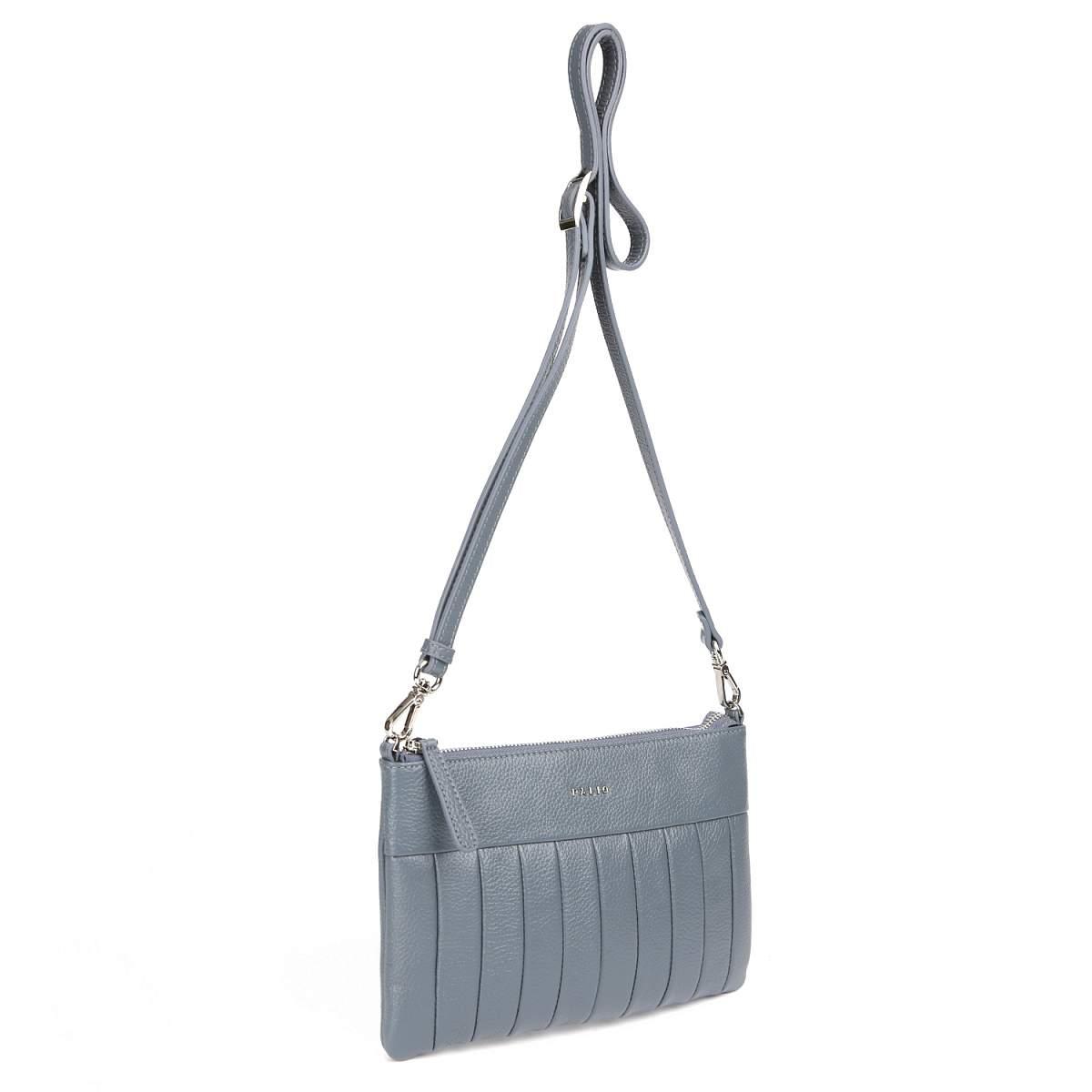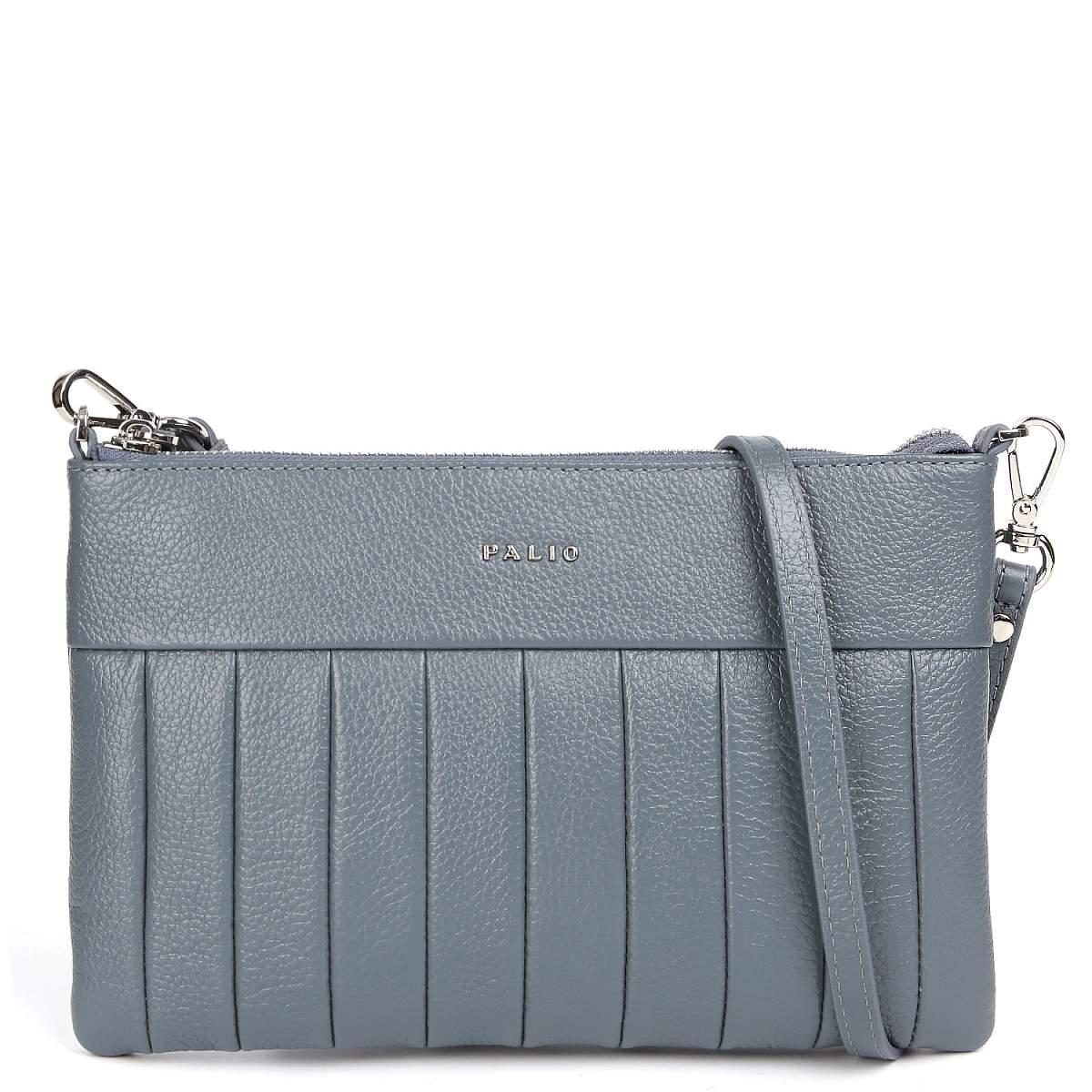 Компактная кросс-боди PALIO в серо-голубом оттенке выполнена из натуральной зернистой кожи. Сумка закрывается на молнию с металлическим поводком. Внутри 2 боковых кармана для мелочей: открытый и на молнии. На тыльной стороне предусмотрен карман быстрого доступа на молнии. Съемный плечевой ремень регулируется по длине, ширина - 1 см. При необходимости его можно снять, и тогда кросс-боди трансформируется в стильный клатч. Цвет фурнитуры - серебро.