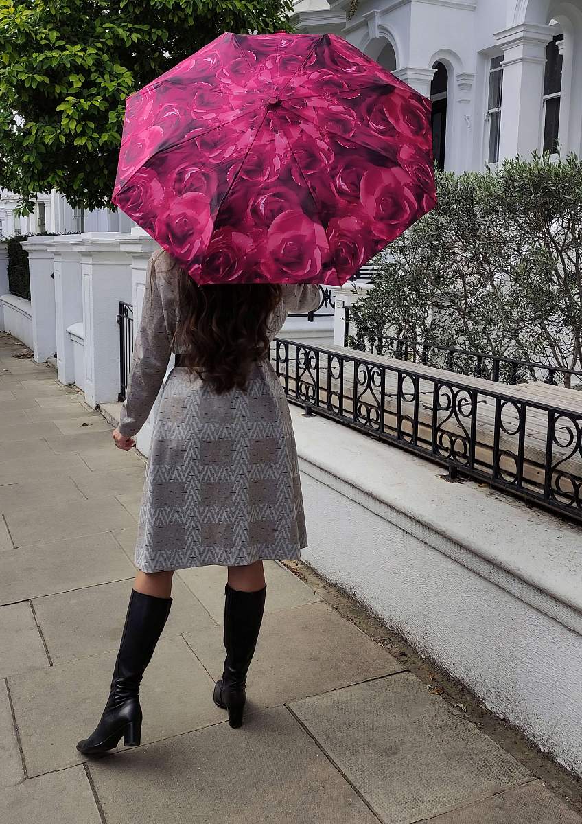 Капли реального дождя на полотне этого зонта эффектно встретятся с виртуальными – запечатленными на лепестках роз. Купол отлично привлекает внимание и, несмотря на практически двухтоновую гамму фотопринта, хорошо сочетается с широким спектром предметов верхней одежды и аксессуаров. У модели ветроустойчивая конструкция.