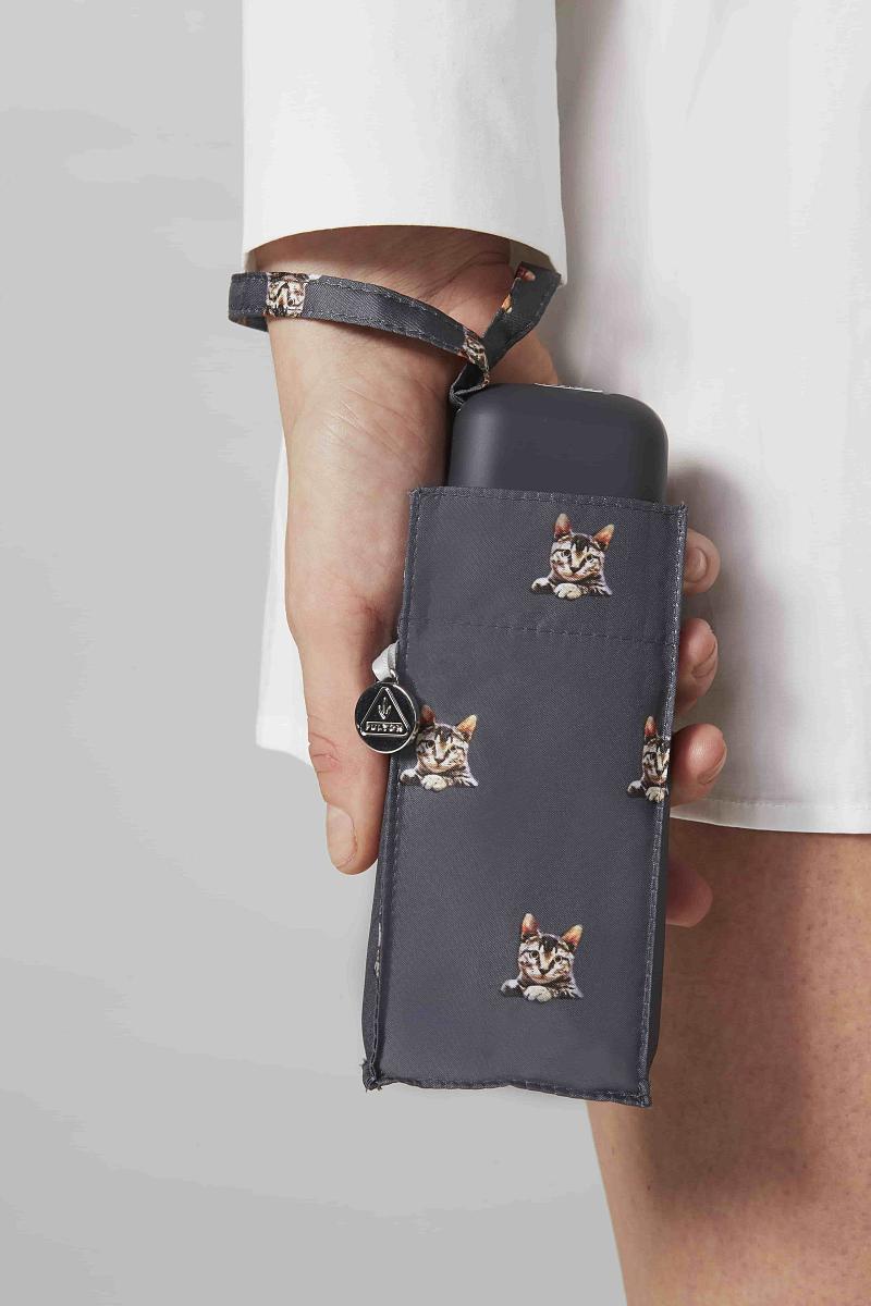К рисунку этого зонта с котиками очень подходит модная фраза: «А у меня лапки», означающая ироничный способ избежать чего-то неприятного. Если присмотреться, то на полотне можно увидеть маленькие трилистники – это фирменный знак Fulton. Настоящие знатоки статусных брендов сразу распознают по ним благородное происхождение этого аксессуара. У зонтика удобная ручка, в которую заправляются спицы, когда зонт закрыт. Каркас ветроустойчивый, изнанка чехла впитывает влагу. В сложенном виде помещается и в сумочку, и в большой карман. Украшен изящной подвеской с логотипом. Брендовая надпись есть также на рукоятке.