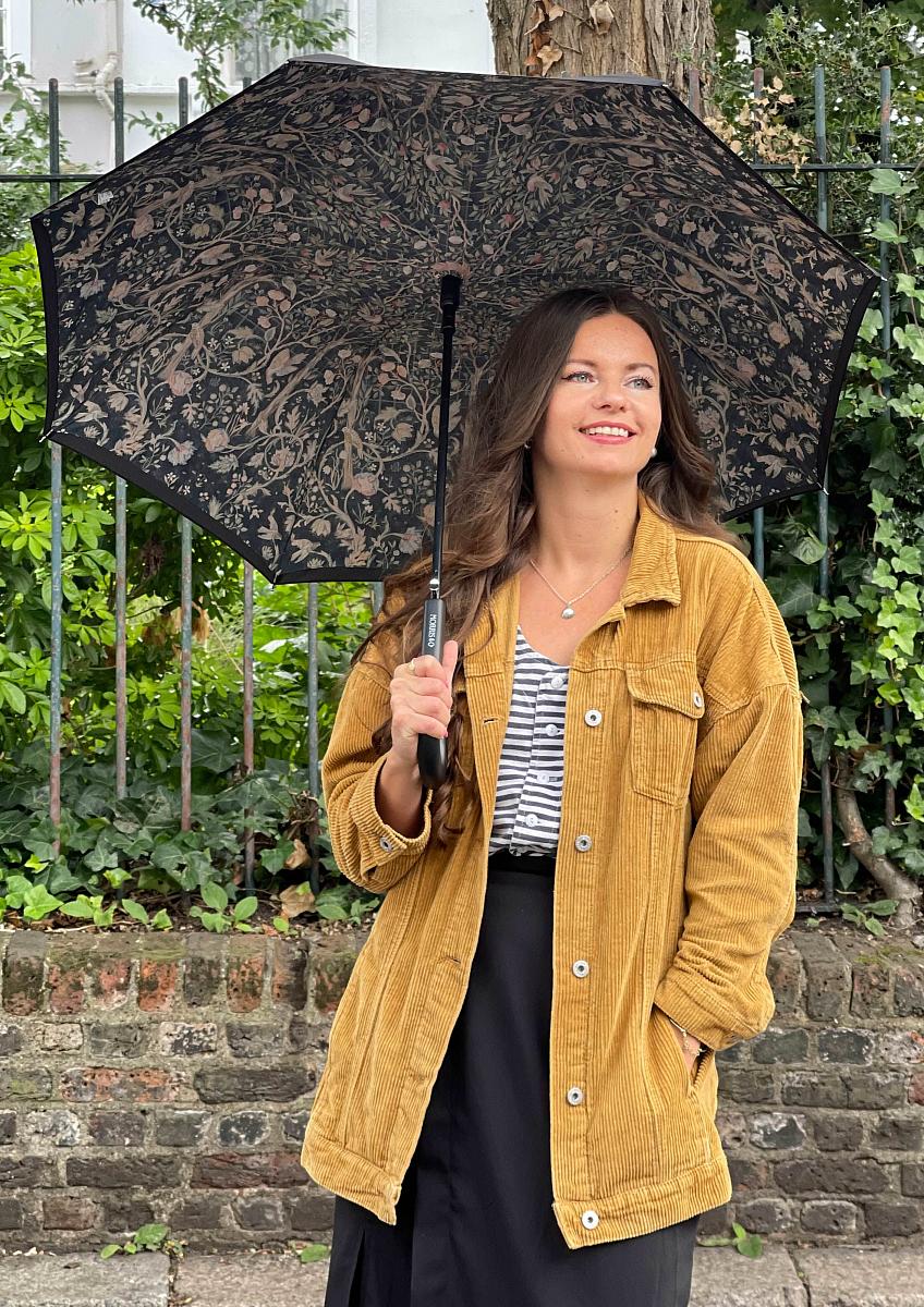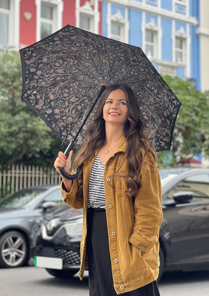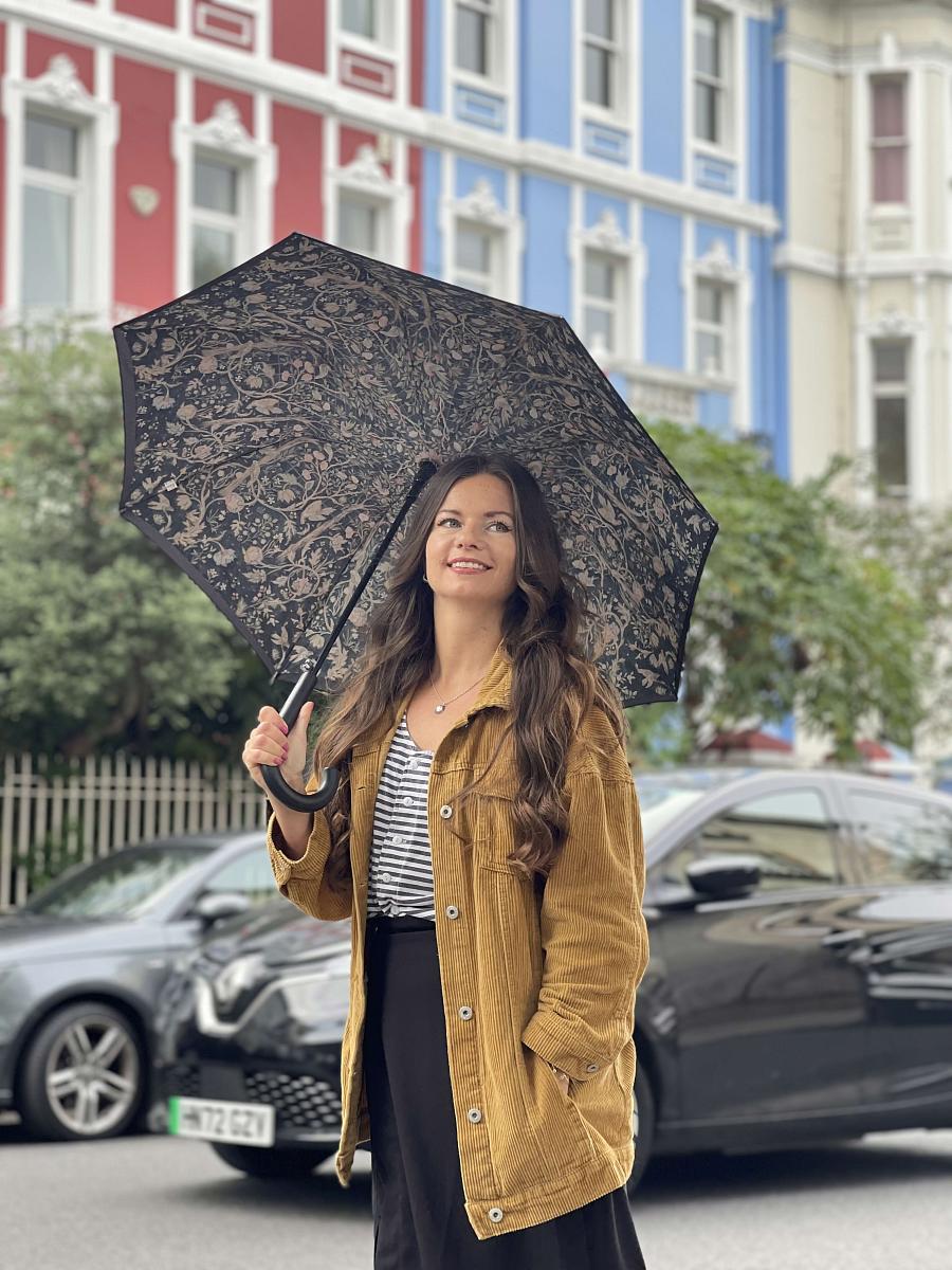 Зонт трость женская с двойным куполом от английского бренда Fulton и неподвластные времени цветочные принты от самого влиятельного дизайнера девятнадцатого века William Morris. Зонт женский автомат имеет стальной стержень и 8 спиц. Удобная ручка крюк. Материал купола – полиэстер с высокой защитой от ультрафиолета (UPF40+). Зонт с большим куполом, его диаметр 94 см. Длина в сложенном виде - 84 см. Вес модели 483 гр. Конструкция двойного купола скрывает спицы для изысканной отделки